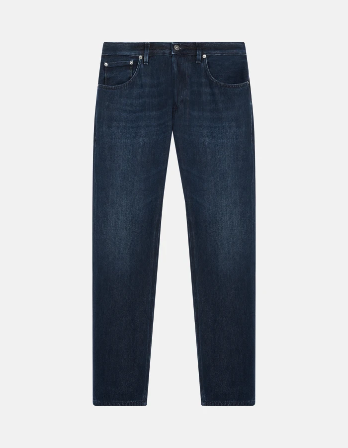 Brighton carrot-fit five-pocket jeans, low waist. Blue cross 12 oz cotton and lyocell rigid denim. Clean dark wash. Dondup logo. Made in Italy
