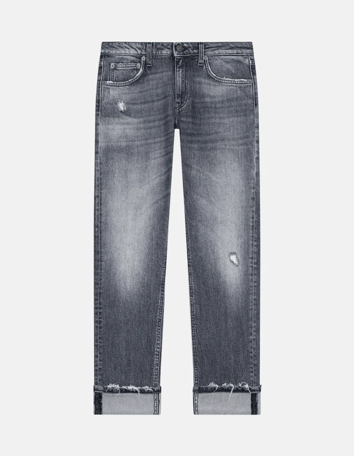 Coco slim-fit five-pocket jeans, regular waist, deep turn-up at ankle. Black 14 oz comfort stretch denim. Black vintage wash with rips. Dondup logo. Made in Italy