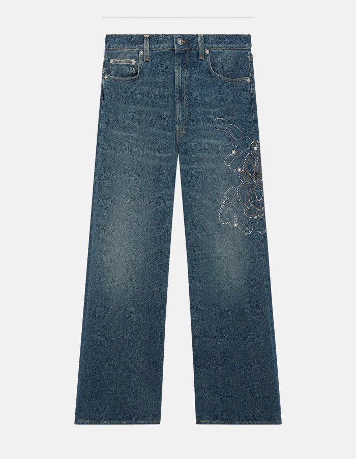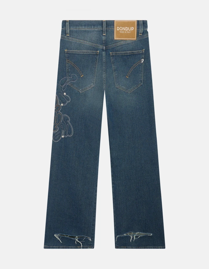 Francine wide-leg five-pocket jeans, low waist. Embroidery and studs on left leg. Blue 12 1/4 oz comfort stretch denim. Vintage dark wash with rips at the ankle Dondup logo. Made in Italy