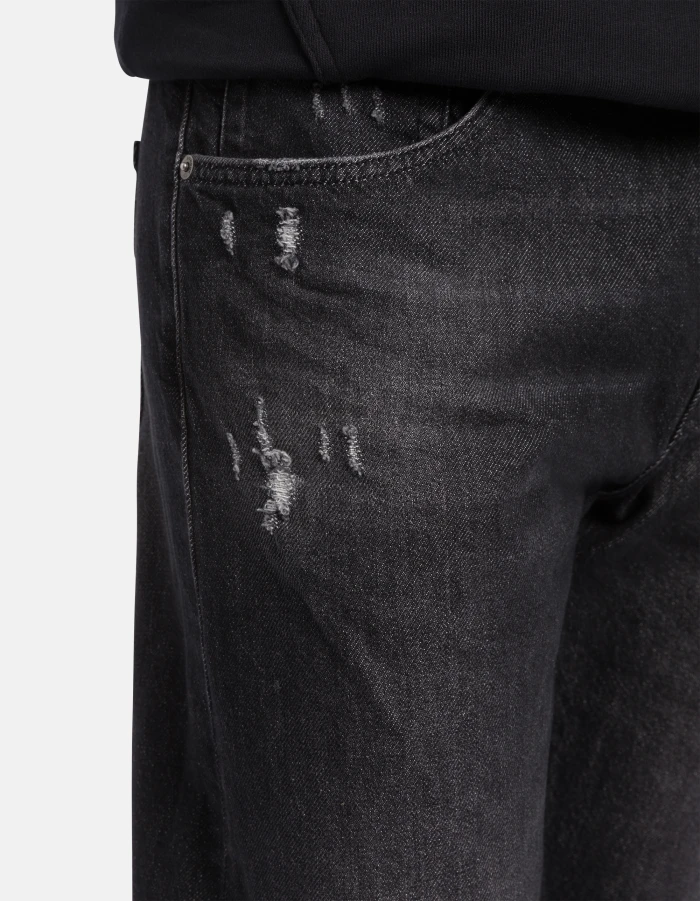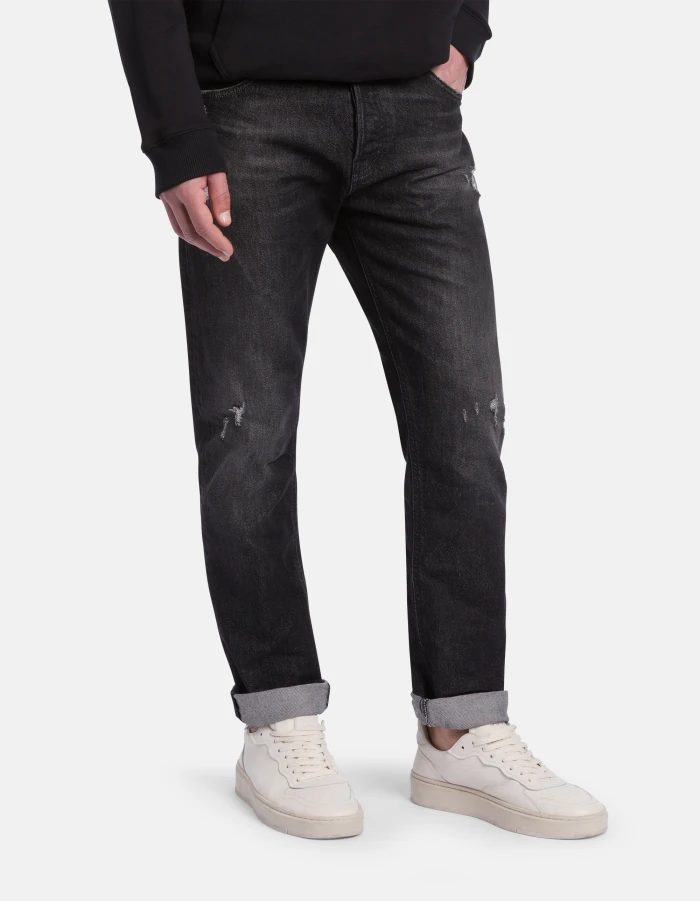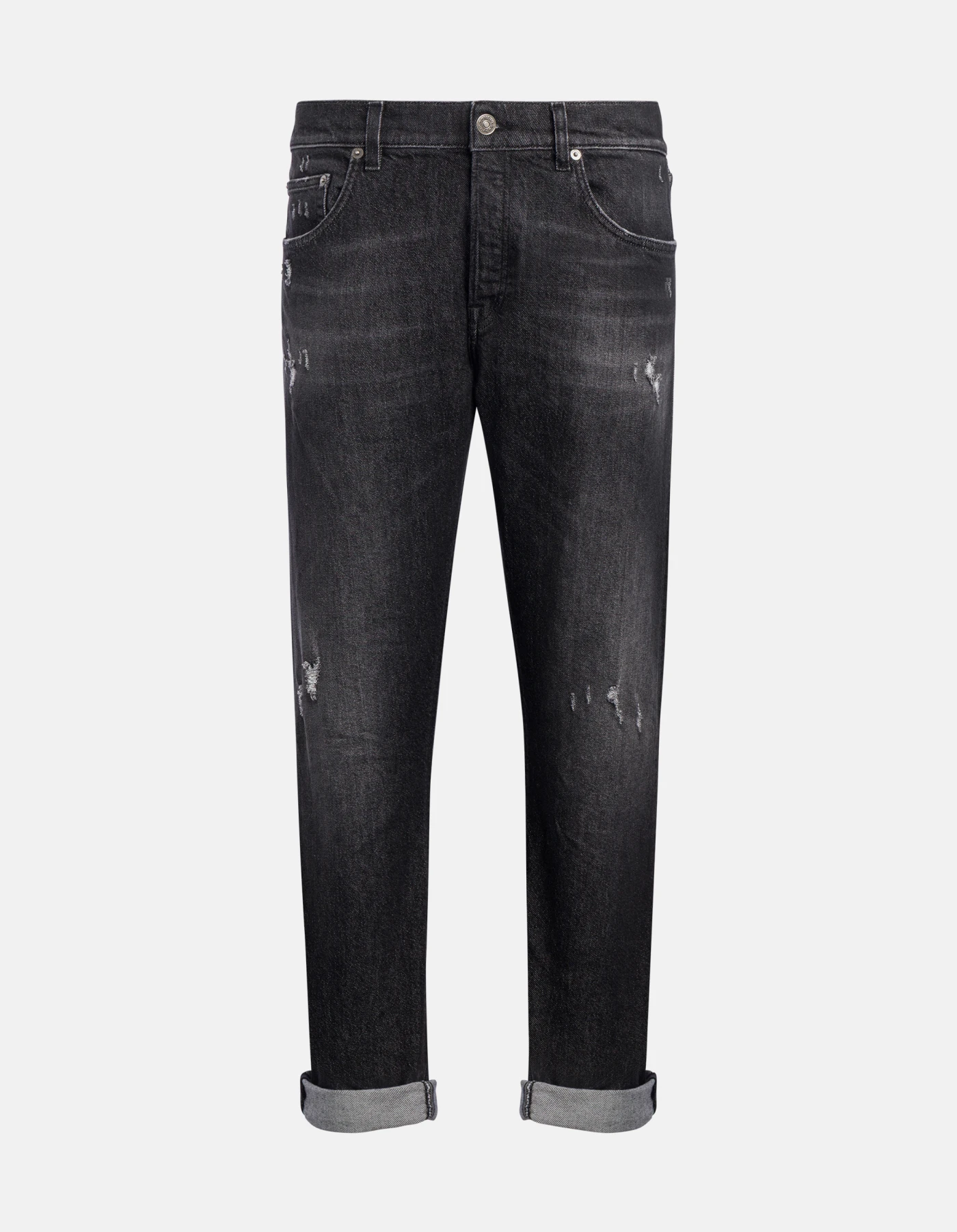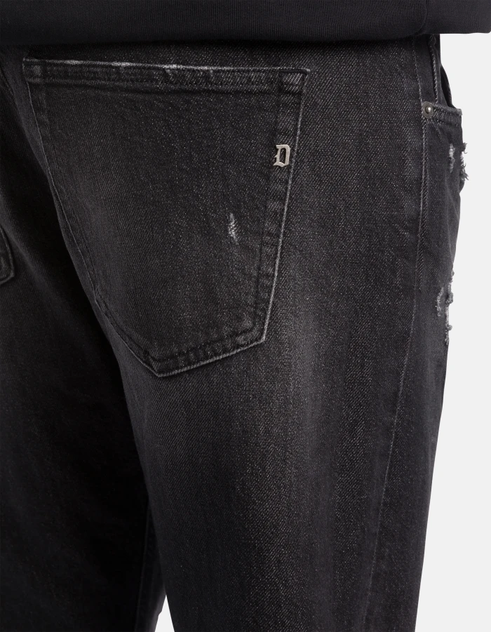 Icon regular-fit 5-pocket jeans, regular waist. Black 14 oz comfort stretch denim. Black vintage wash with rips. Dondup logo. Made in Italy