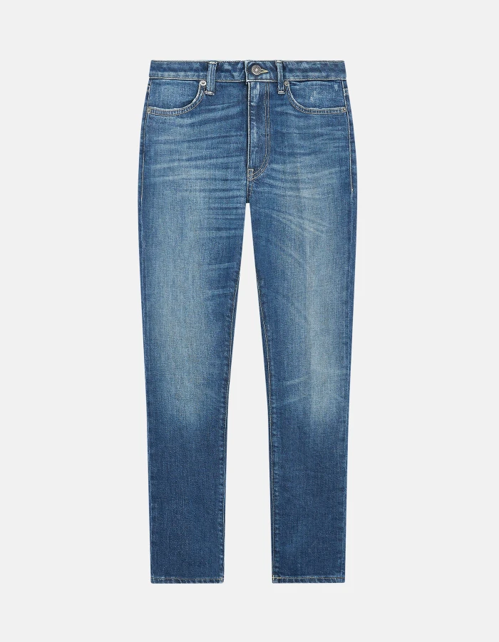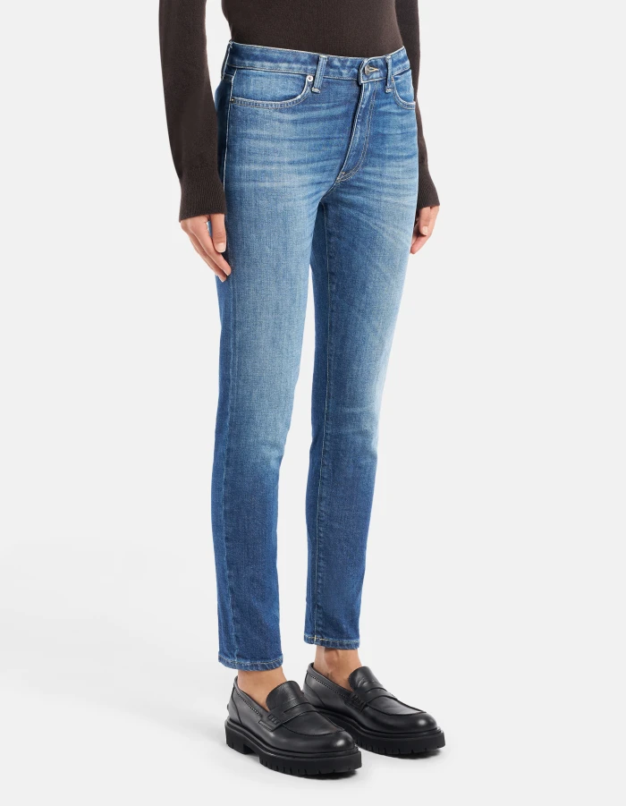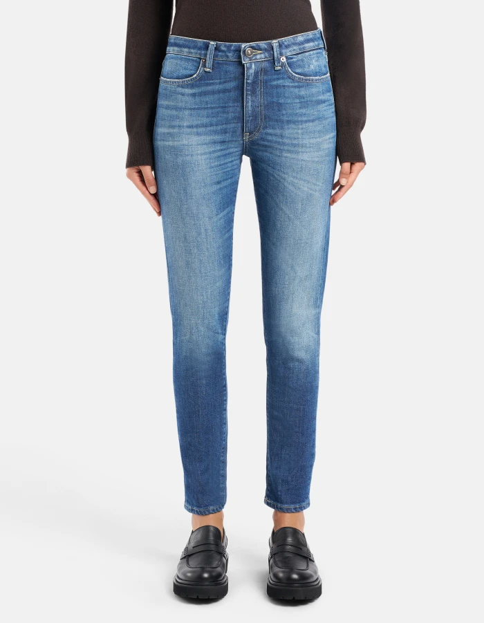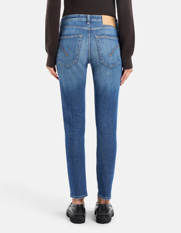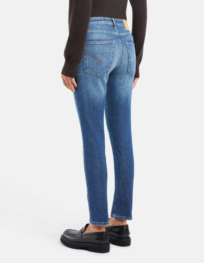 Iris super skinny five-pocket jeans, high waist, ankle length. Blue 11 1/2 oz sustainable stretch denim.  Medium-light GOTS wash with micro-rips. Dondup logo. Made in Italy