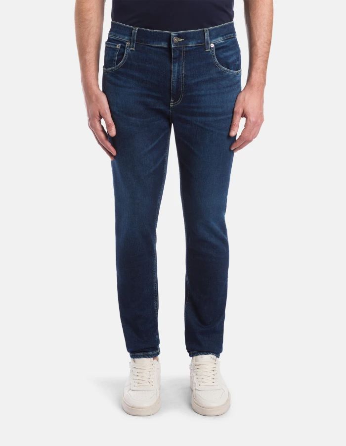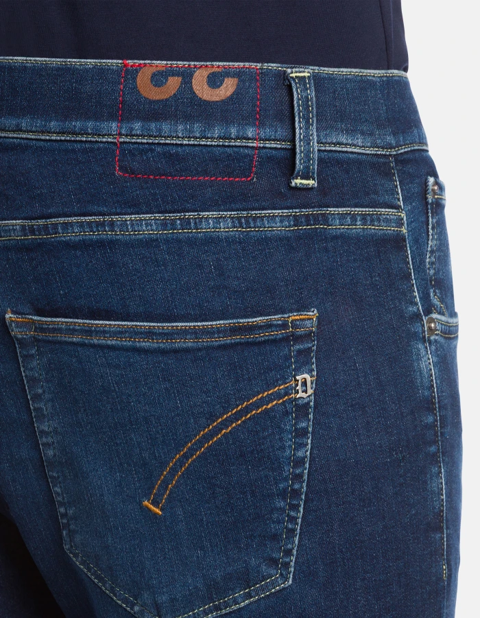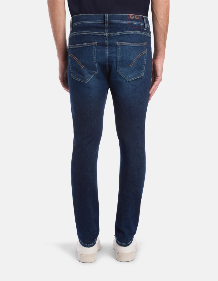Jackie super-skinny 5-pocket jeans, regular waist. Blue 11 oz high-stretch denim. Clean dark wash. Dondup logo. Made in Italy