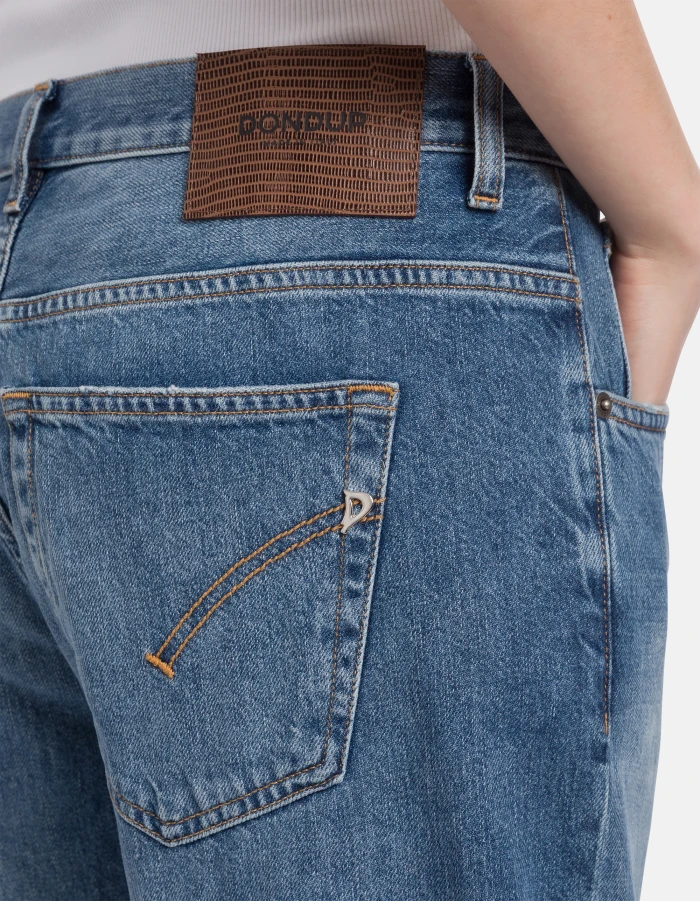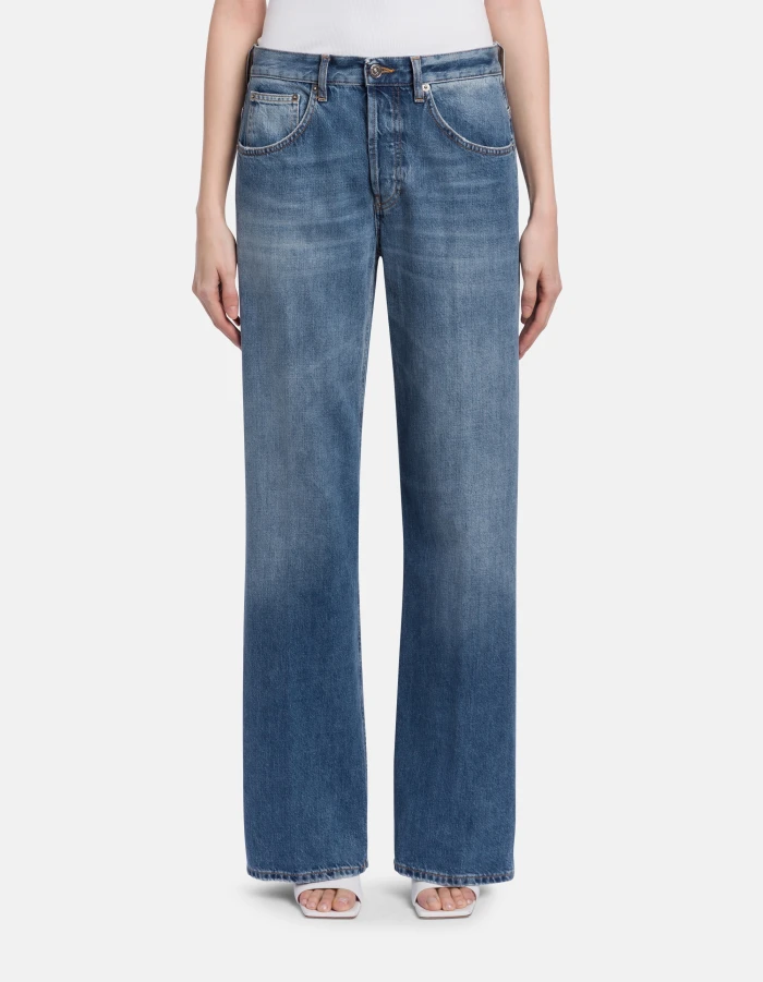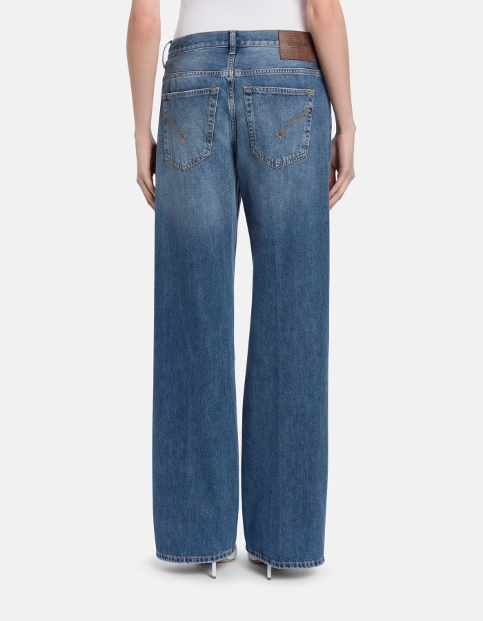 Jacklyn wide-leg 5-pocket palazzo jeans, low rise. Blue 12.5 oz rigid cross denim. Medium dark vintage wash. Dondup logo. Made in Italy