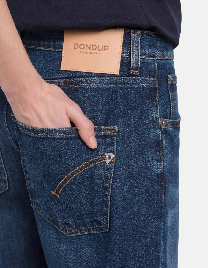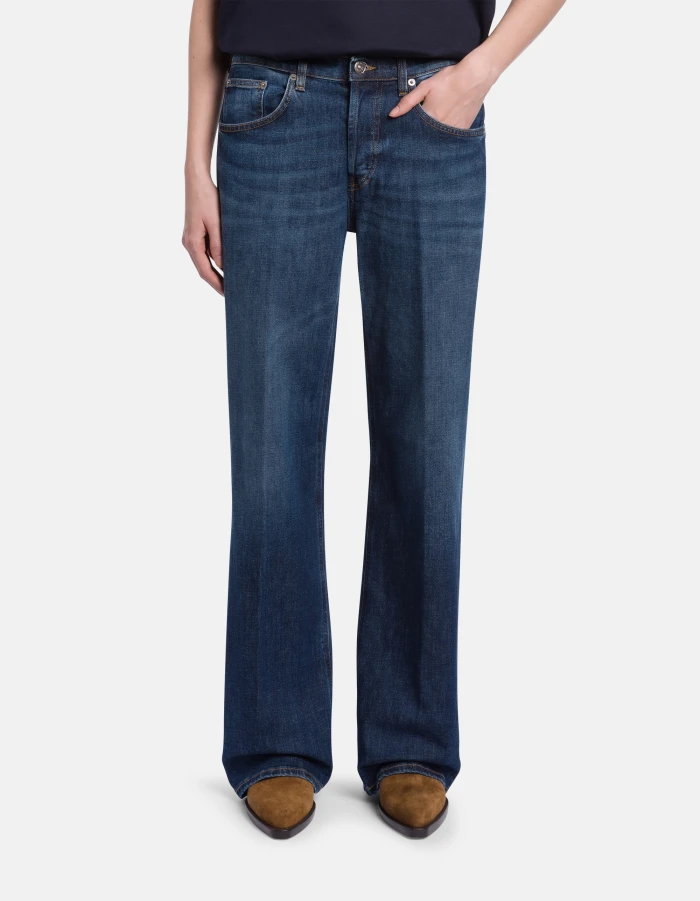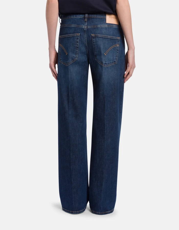 Jacklyn wide-leg 5-pocket palazzo jeans, low rise. Blue 11.5 oz bluesign APPROVED stretch denim. Clean medium wash. Dondup logo. Made in Italy