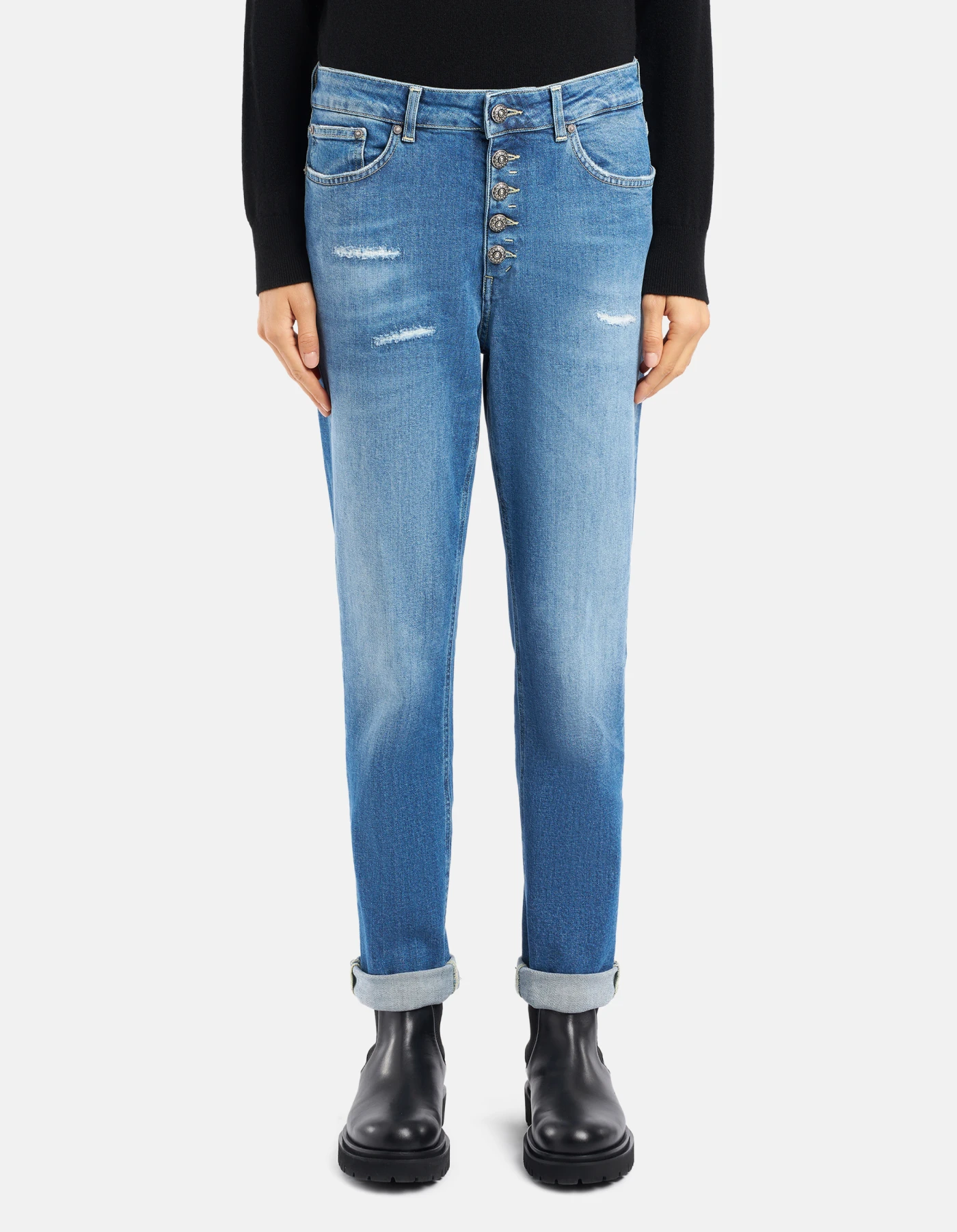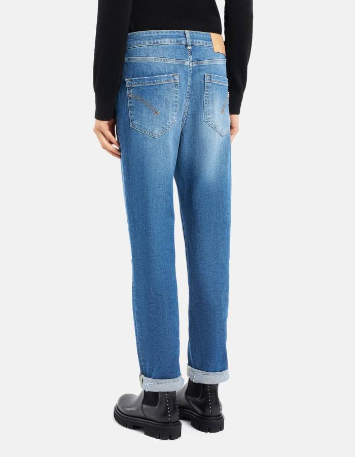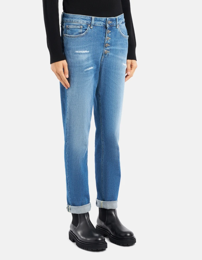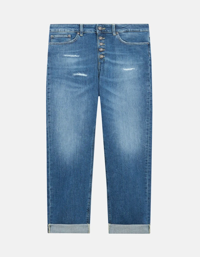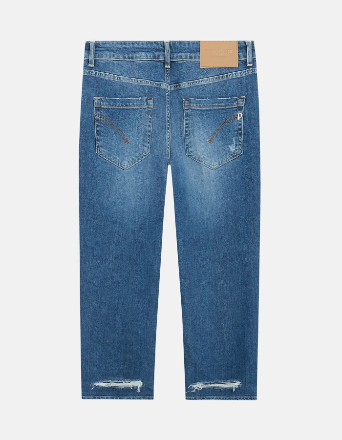 Koons loose-fit five-pocket 30-inch jeans, regular waist, jewel button panel. Blue 11 1/2 oz sustainable stretch denim.  Medium-light GOTS wash with repairs. Dondup logo. Made in Italy