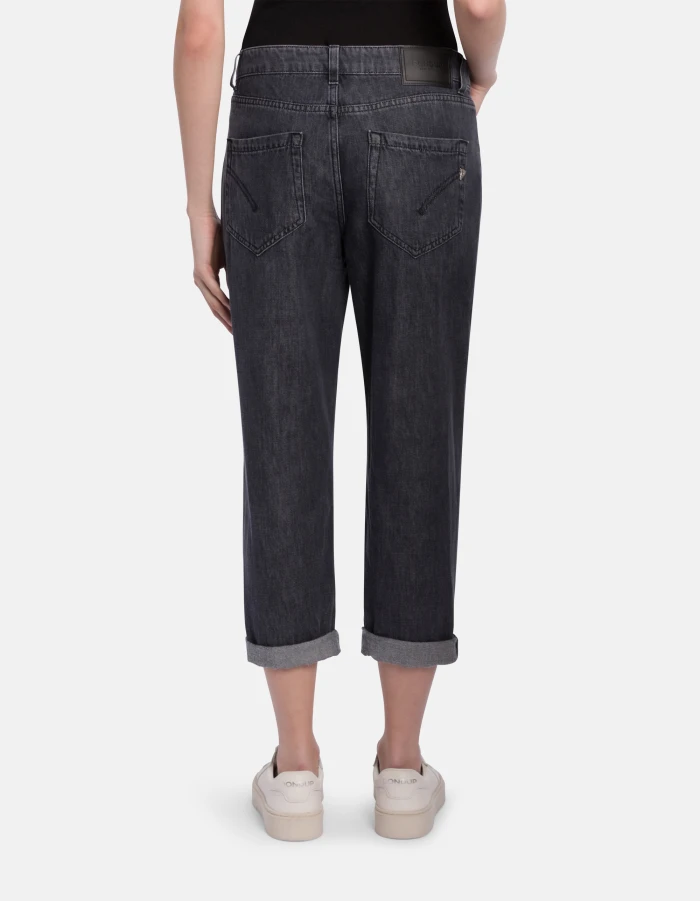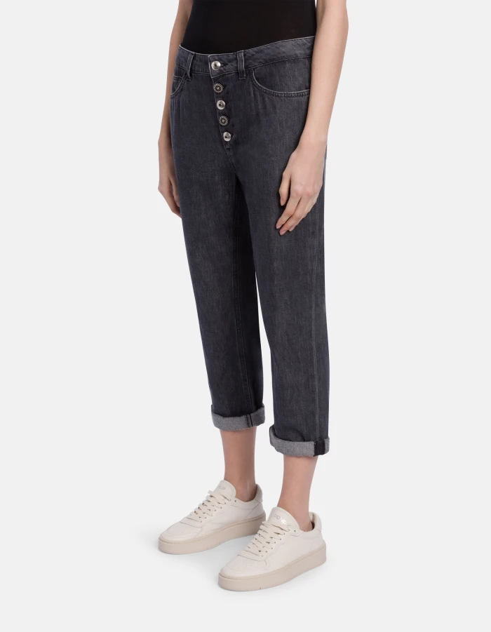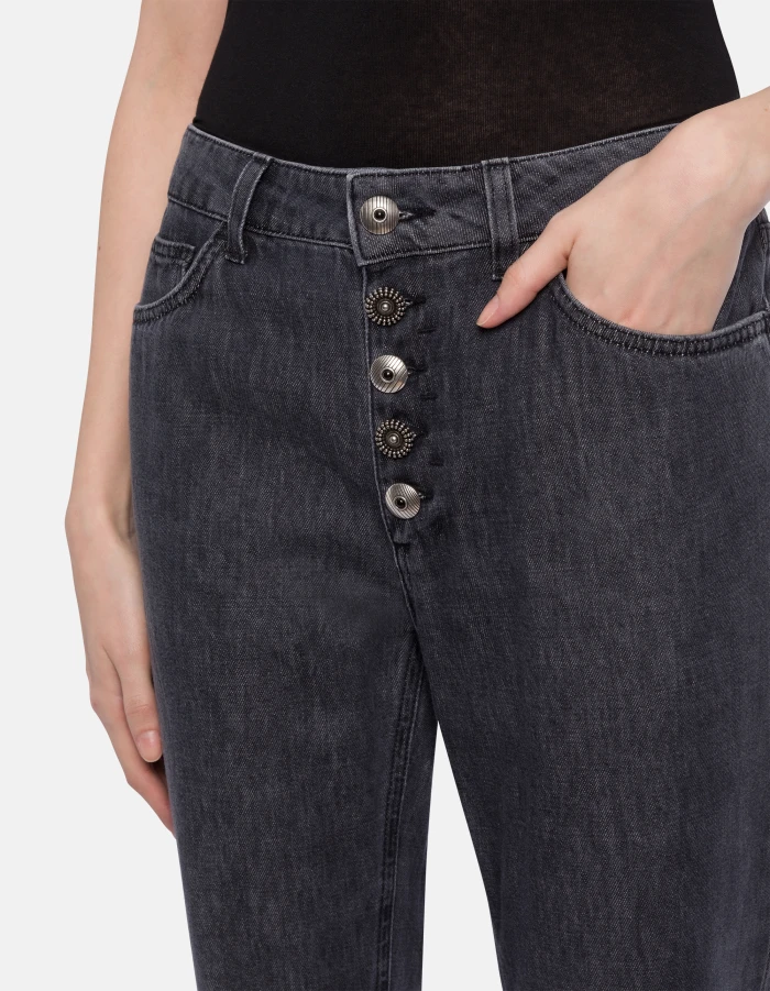 Koons loose-fit 5-pocket jeans, regular waist, jewel button panel, ankle length. Black 8.75 oz cotton and lyocell rigid denim. Clean black vintage wash. Dondup logo. Made in Italy