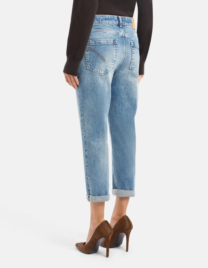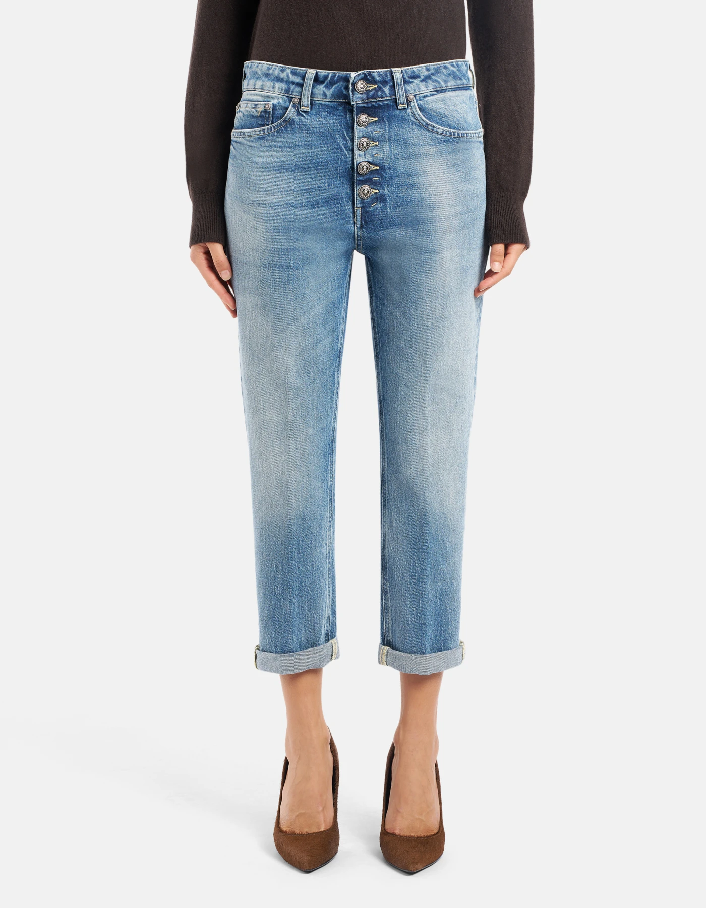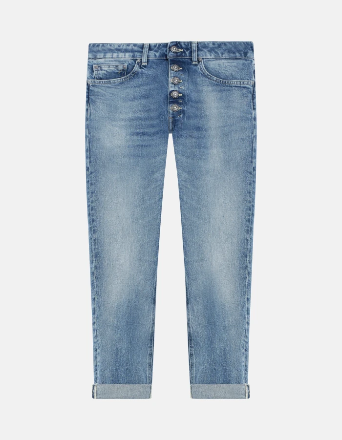 Koons loose-fit five-pocket jeans, regular waist, jewel button panel, ankle length. Blue 12 1/2 oz recycled comfort stretch denim. Clear clean vintage wash. Dondup logo. Made in Italy