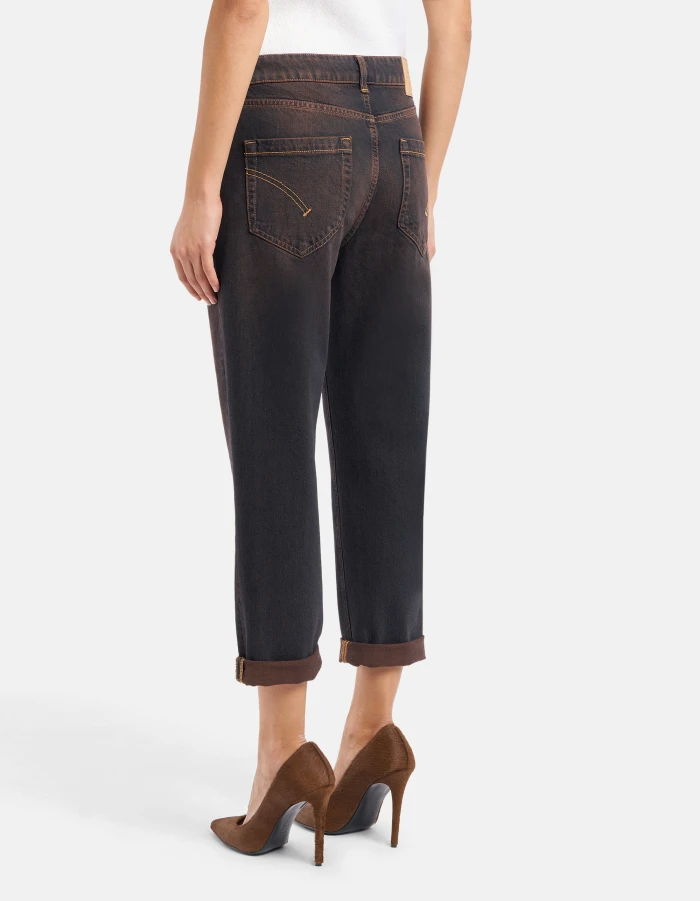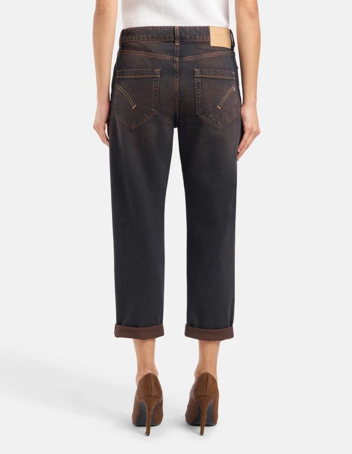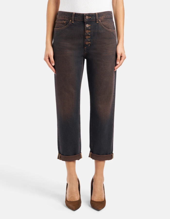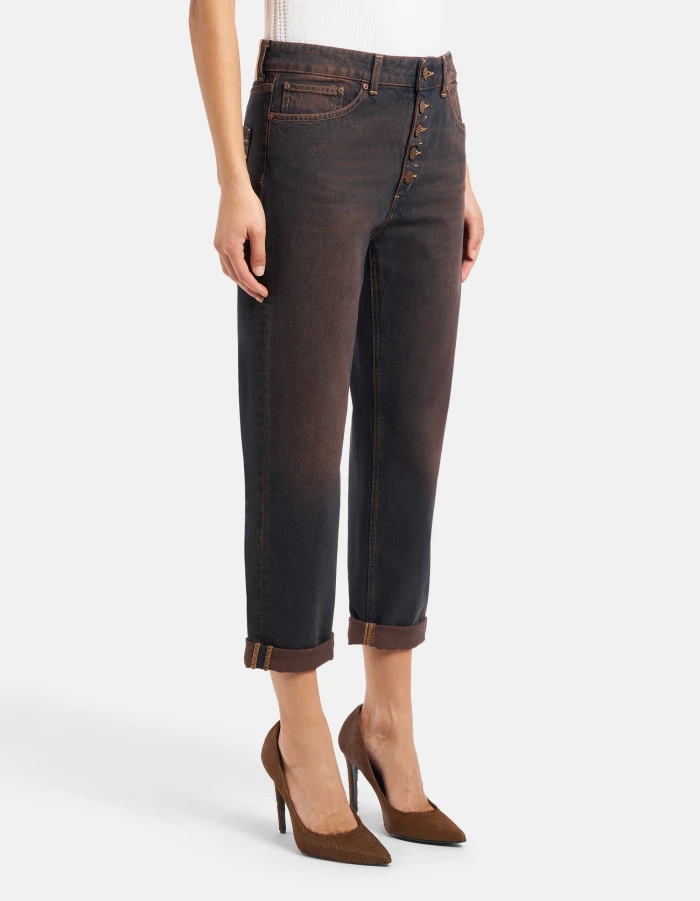 Koons loose-fit five-pocket jeans, regular waist, jewel button panel, ankle length. Blue 13 oz salt & pepper rigid denim. Clean dark overdyed wash. Dondup logo. Made in Italy