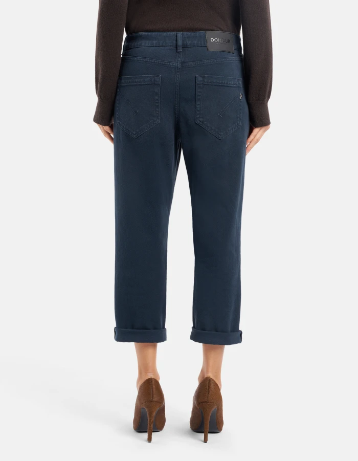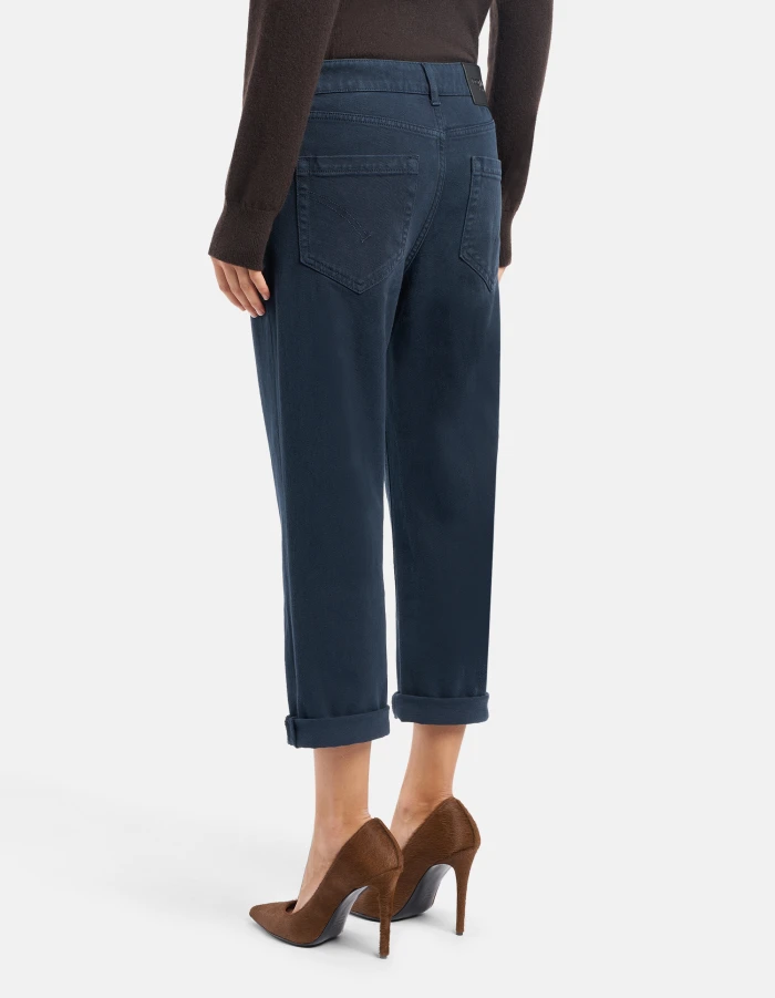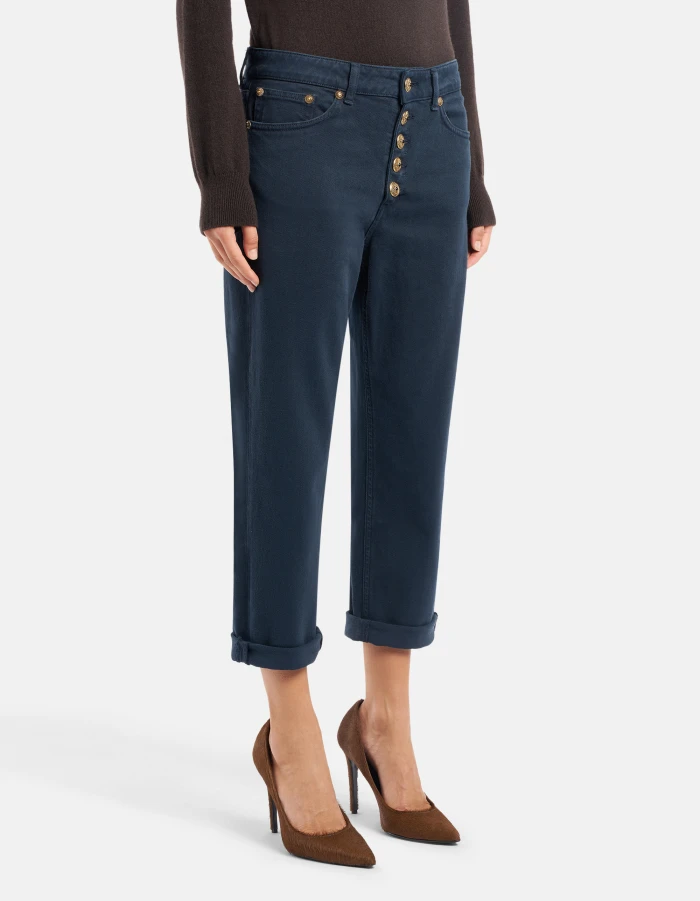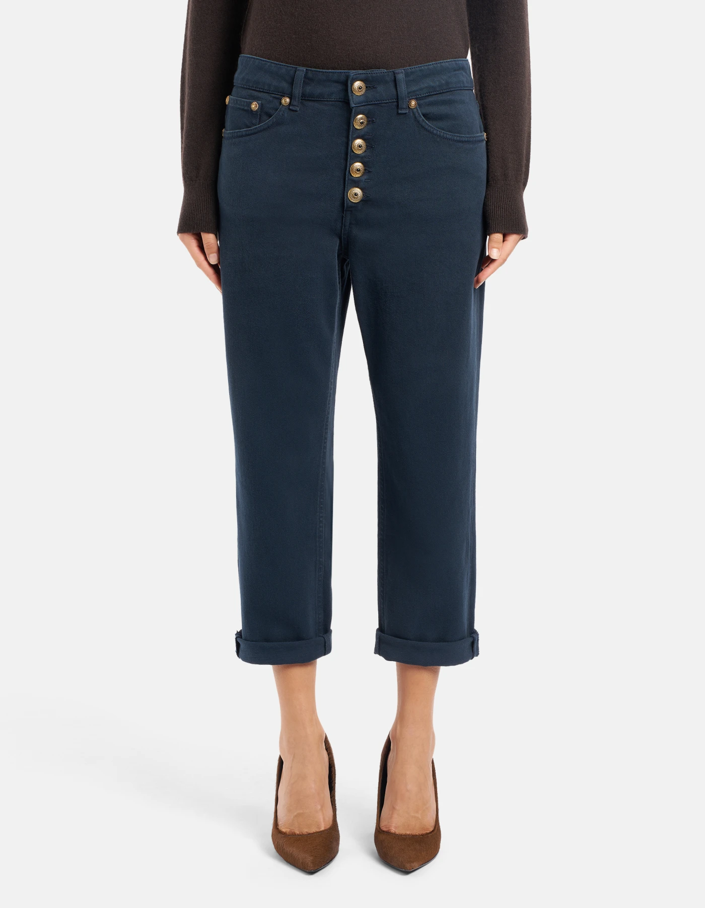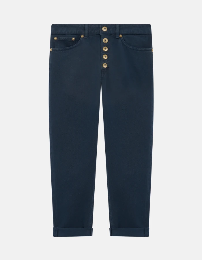 Koons loose-fit five-pocket jeans, regular waist, jewel button panel, ankle length. 11 1/2 oz bluesign APPROVED stretch bull denim. Bluesign garment dyed. Dondup logo. Made in Italy