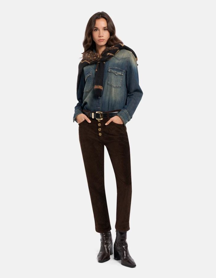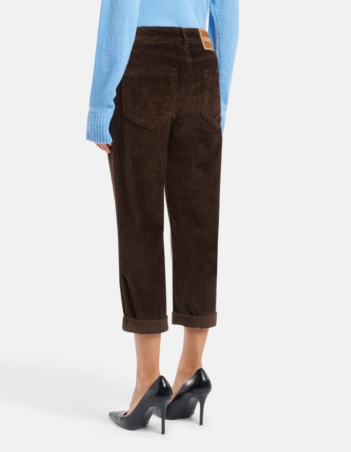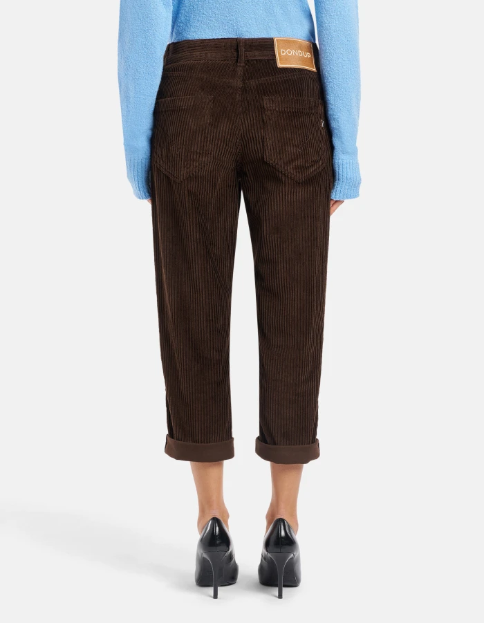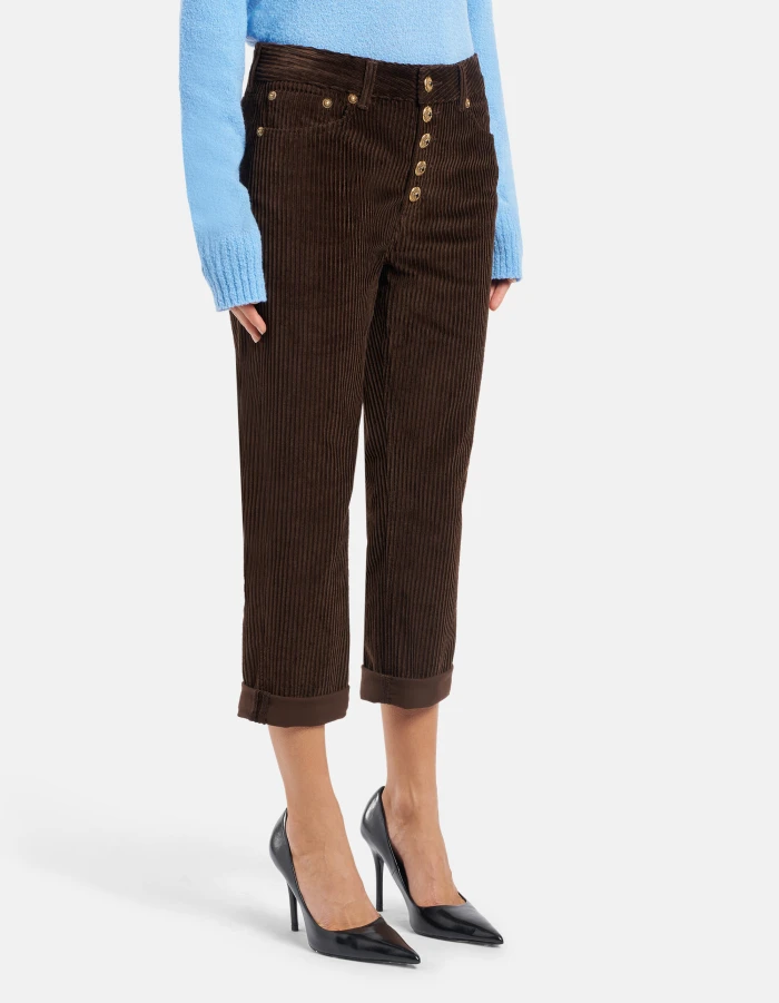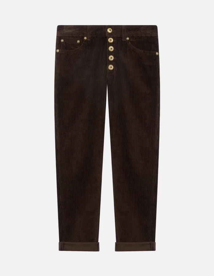 Koons loose-fit five-pocket trousers, regular waist, jewel button panel, ankle length. 500 rib stretch needlecord. Dondup logo. Made in Italy