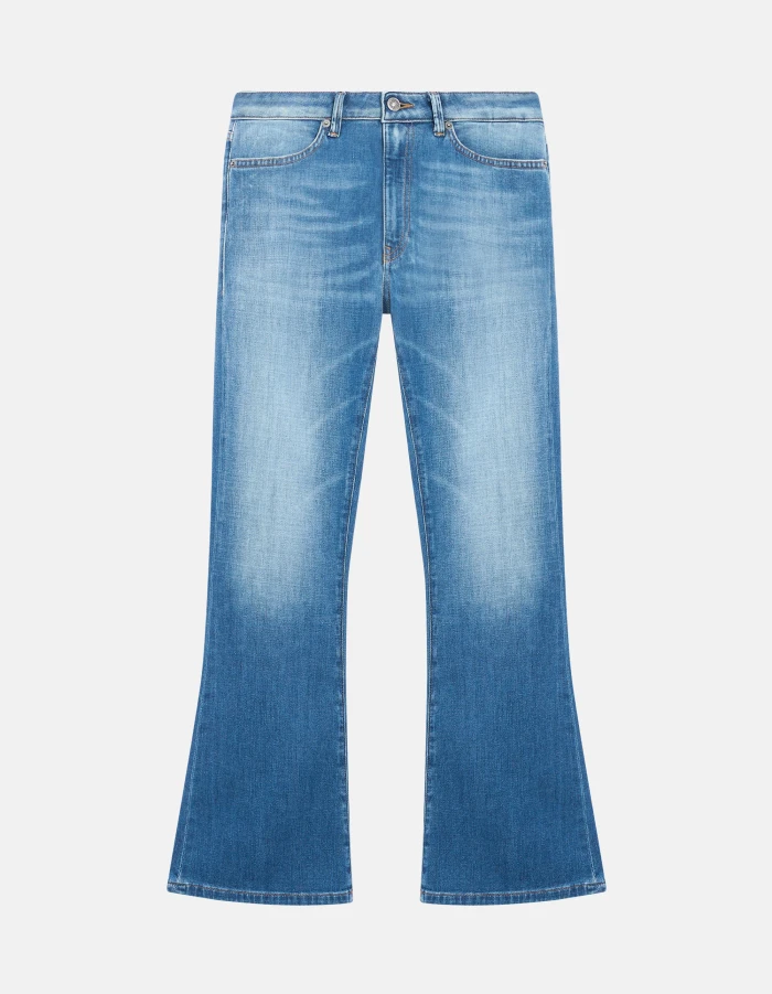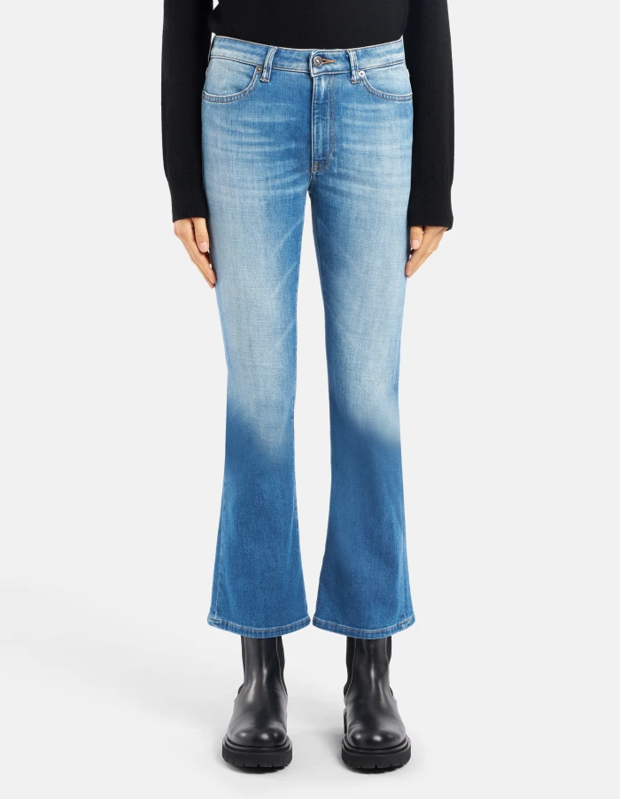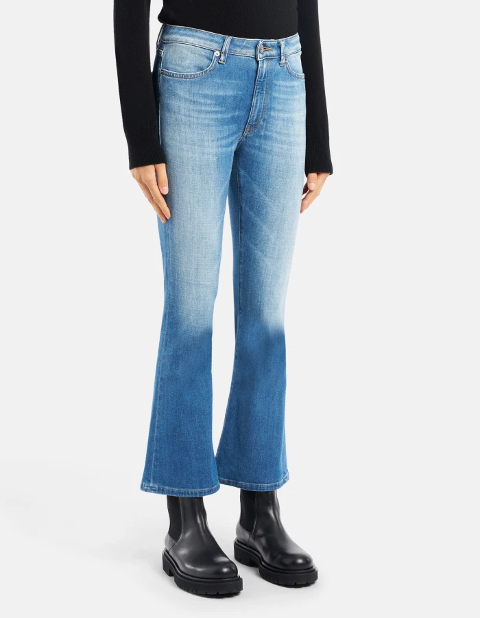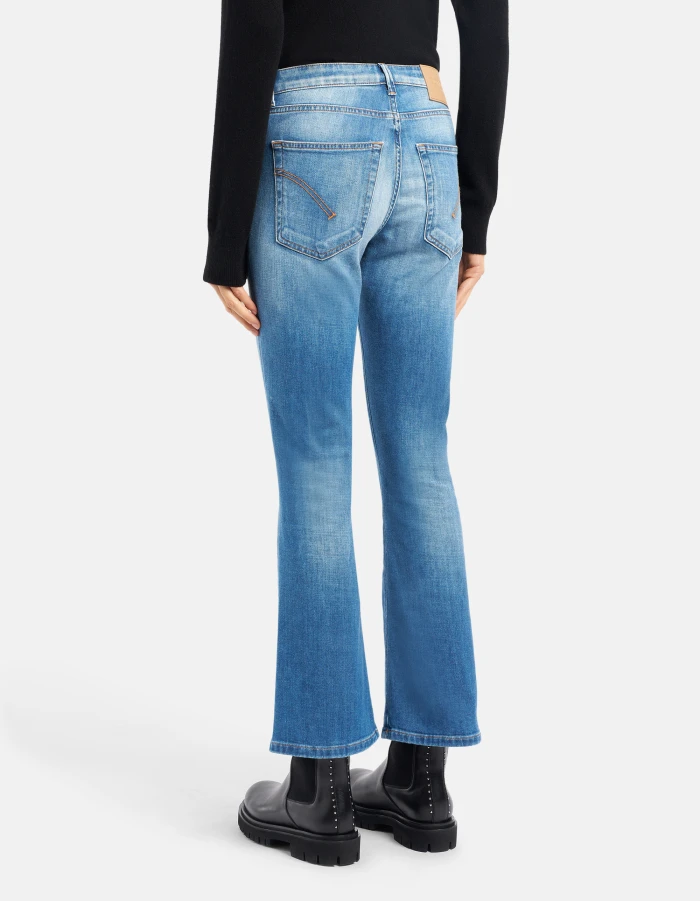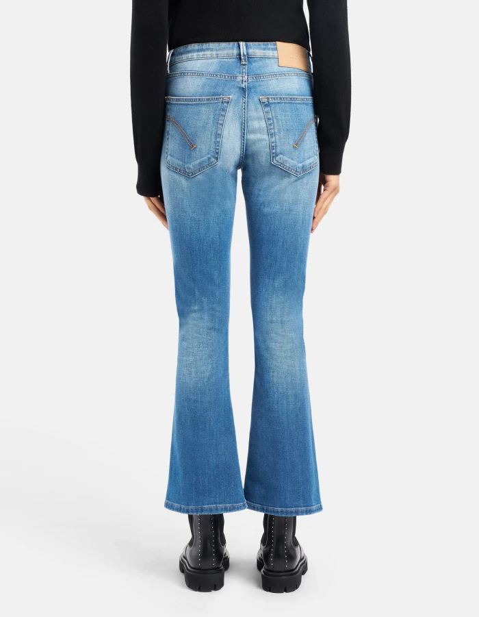 Mandy super skinny five-pocket bootcut jeans, high waist, length above the ankle. Blue 10 oz left-hand stretch denim. Light clean wash. Dondup logo. Made in Italy
