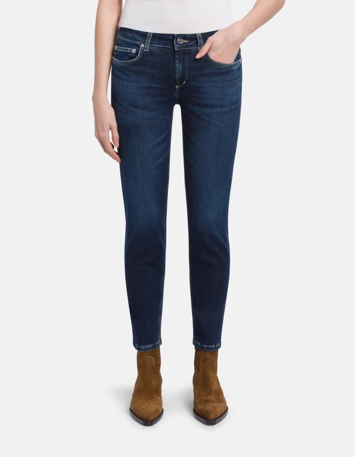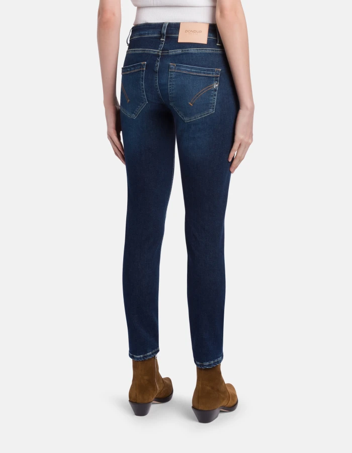 Monroe skinny-fit 5-pocket jeans, low rise, ankle length. Blue 11 oz high-stretch denim. Clean dark wash. Dondup logo. Made in Italy
