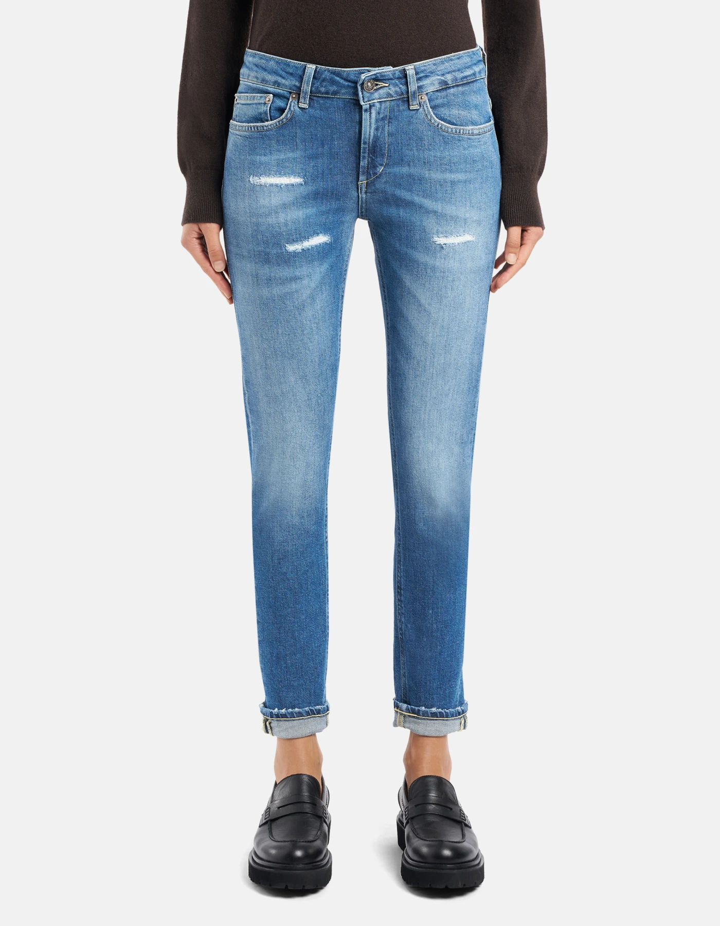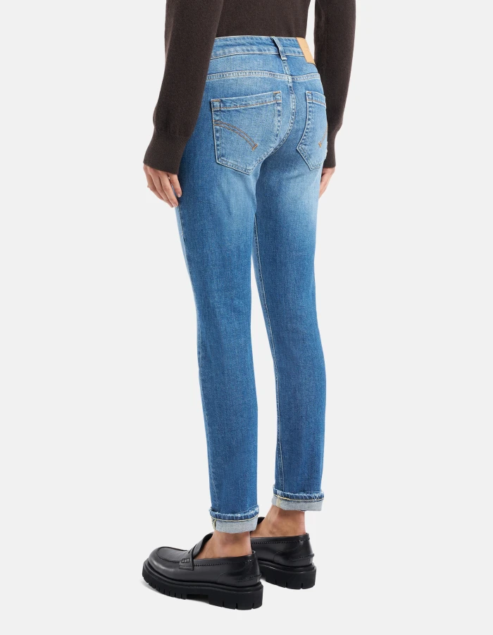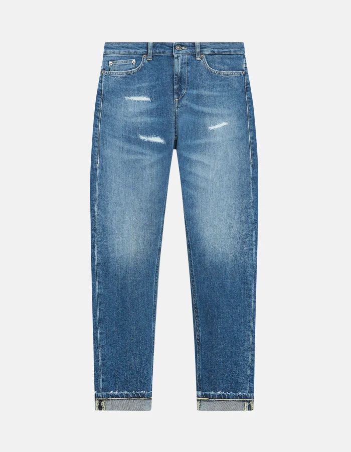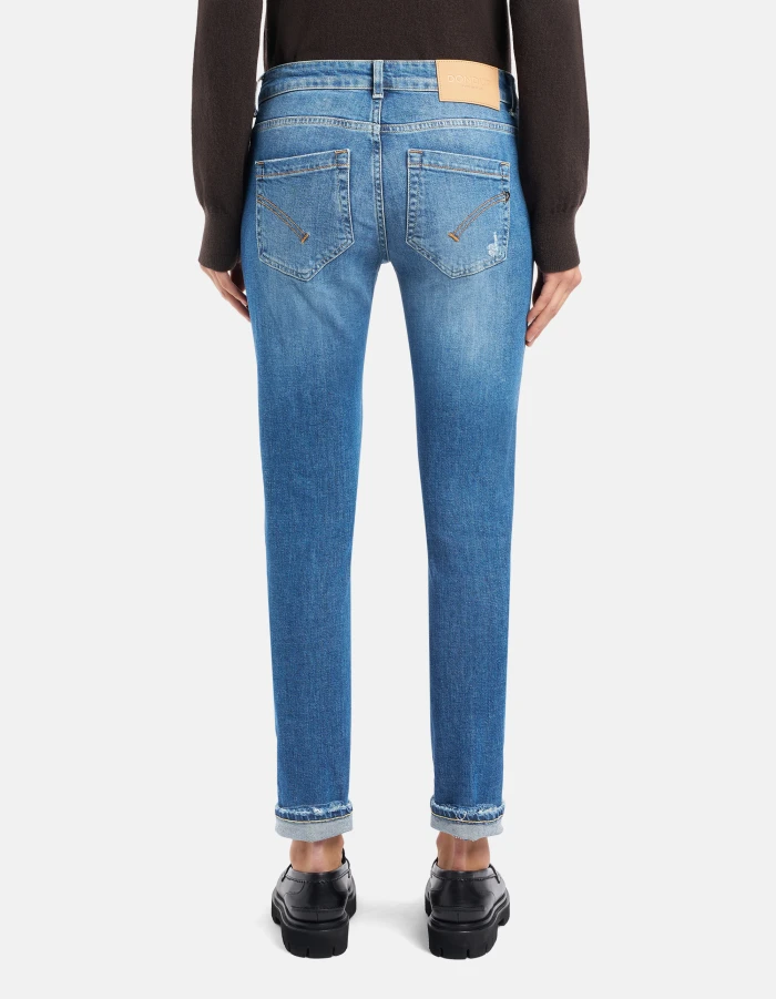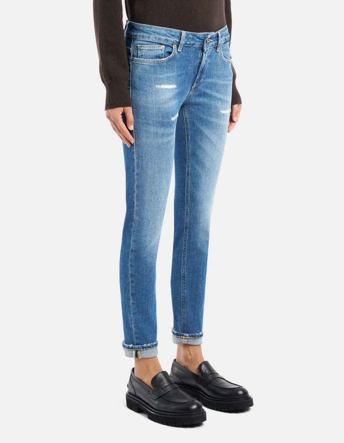 Monroe skinny-fit five-pocket jeans, low waist, ankle length. Blue 11 1/2 oz sustainable stretch denim.  Medium-light GOTS wash with repairs. Dondup logo. Made in Italy