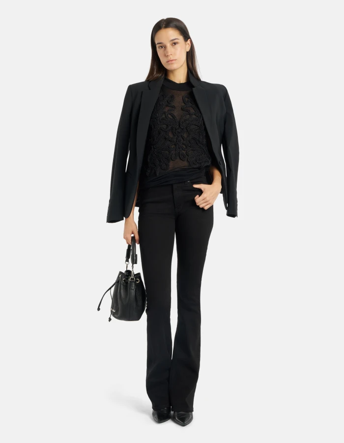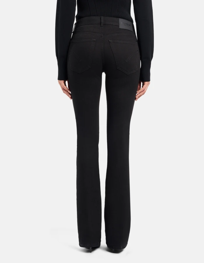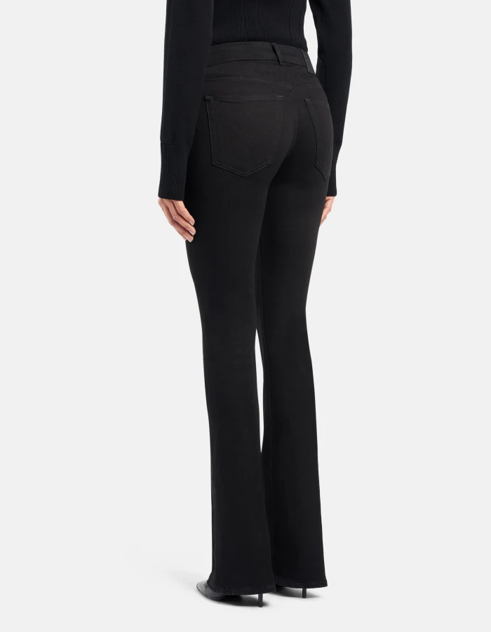 Newlola skinny-fit five-pocket bootcut jeans, high waist. Black black 10 oz recycled stretch denim. GRS clean black wash. Dondup logo. Made in Italy