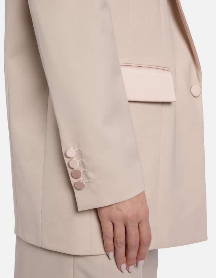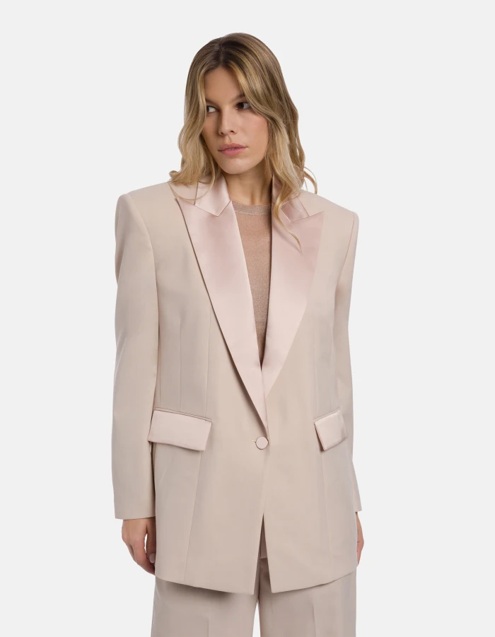 Oversized single-breasted with single covered-button fastening, satin peak lapels and wide shoulders. Wool-blend gabardine. Dondup logo. Made in Italy