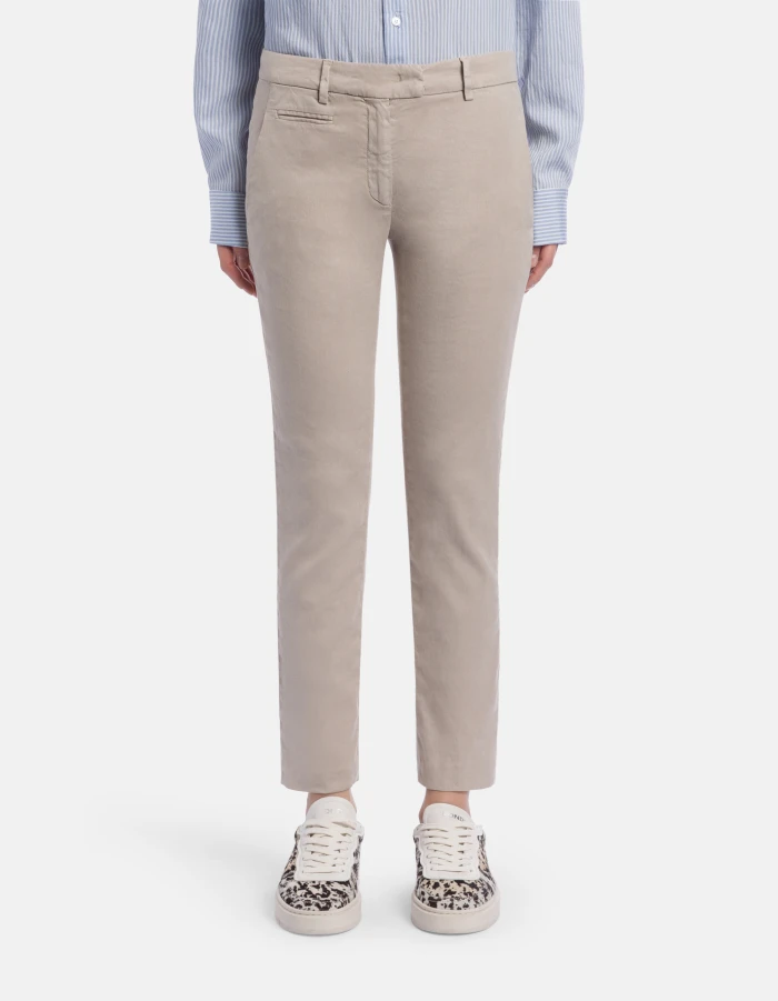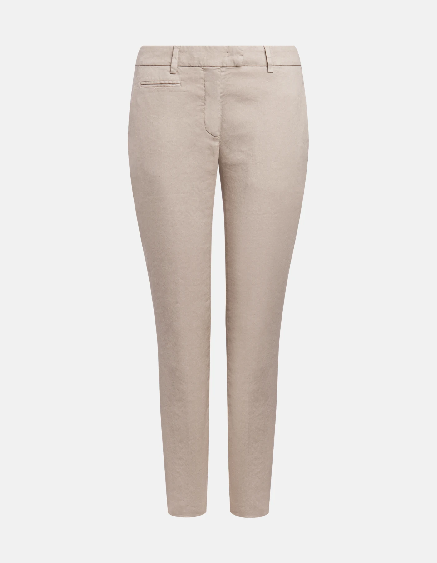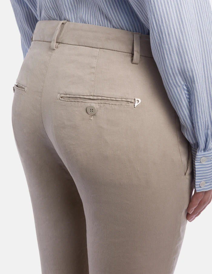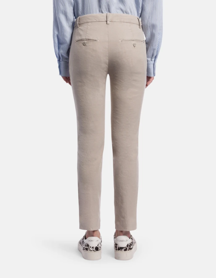 Perfect slim-fit cropped chinos, regular waist, welt pockets at the back. Stretch linen and lyocell. Garment dyed. Dondup logo. Made in Italy