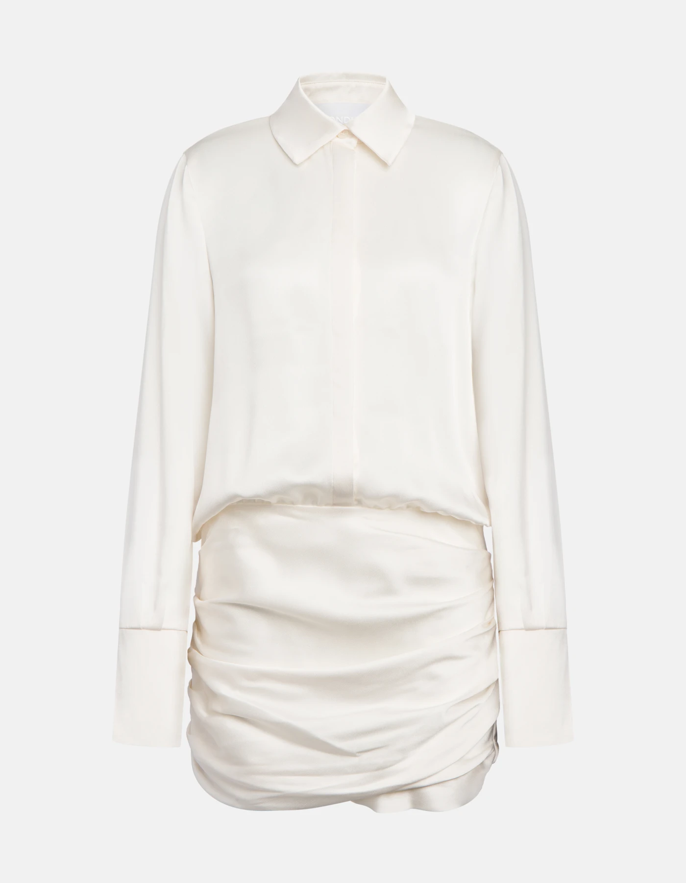 Short, long-sleeved dress with gathered skirt and concealed button fastening. Satin. Dondup logo. Made in Italy
