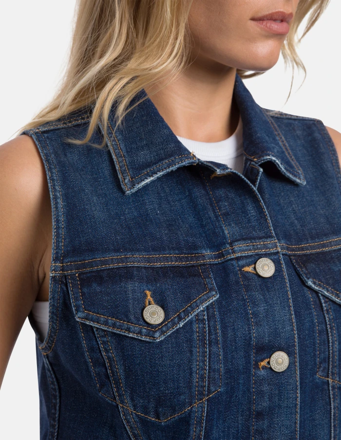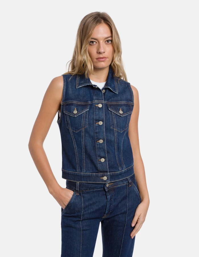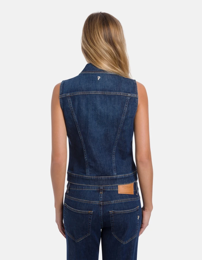 Slim-fit 5-pocket waistcoat with stud-button fastening. Blue 11.5 oz bluesign APPROVED stretch denim. Bluesign clean dark wash. Dondup logo. Made in Italy