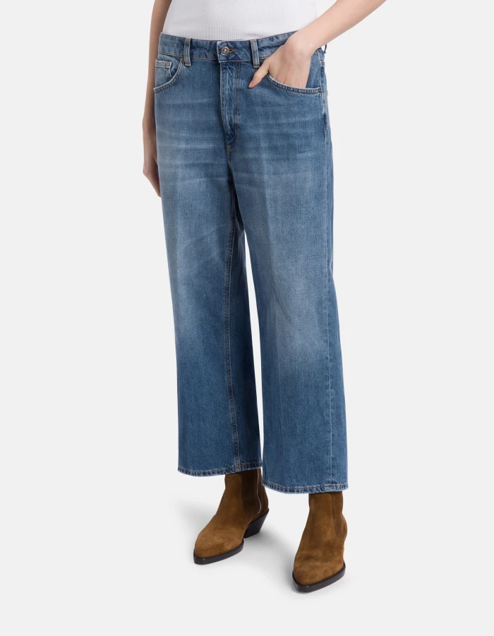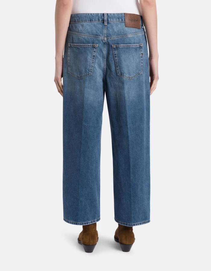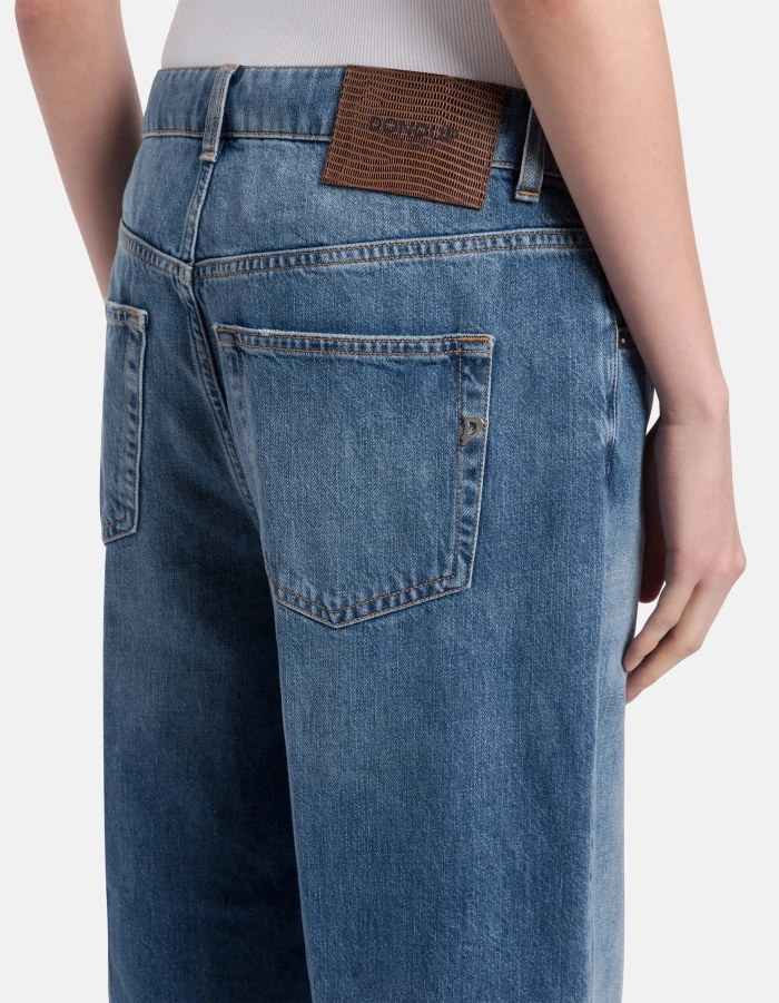 Tami wide-leg 5-pocket palazzo jeans, low rise. Blue 12.5 oz rigid cross denim. Medium dark vintage wash. Dondup logo. Made in Italy