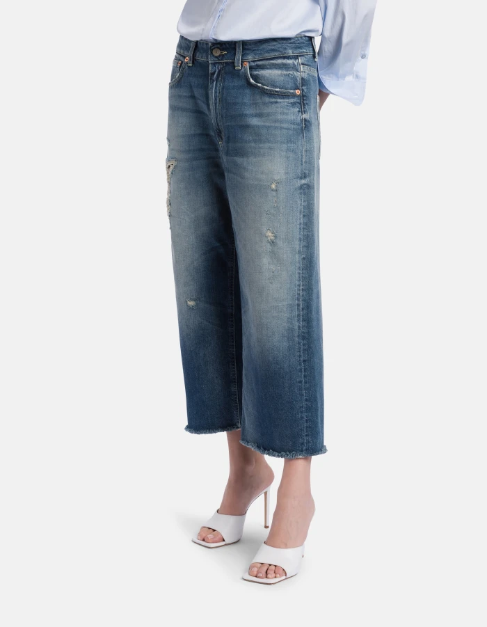 Tami wide-leg 5-pocket palazzo jeans, low rise. Blue 12.5 oz rigid cross denim. Medium dark vintage wash with repairs. Dondup logo. Made in Italy