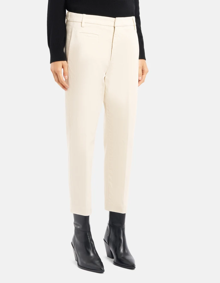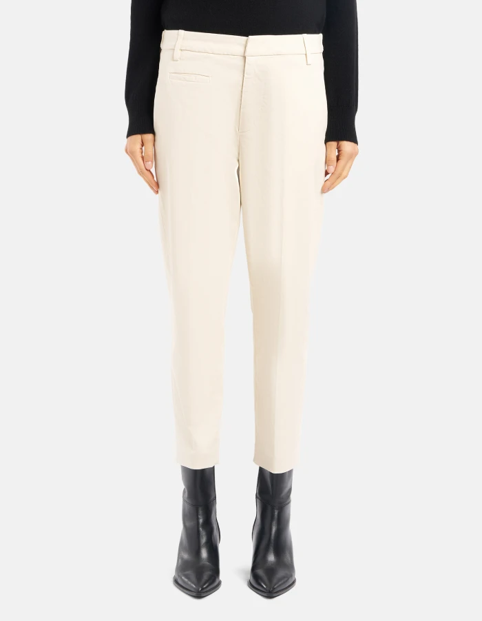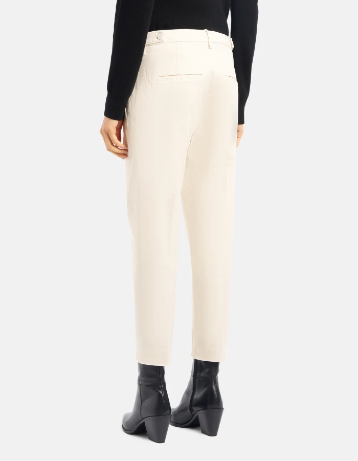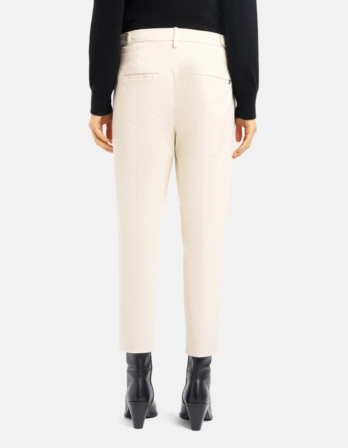 Ariel carrot-fit chino trousers, regular waist, welt pockets at the back, ankle length. Stretch gabardine. Garment dyed. Dondup logo. Made in Italy