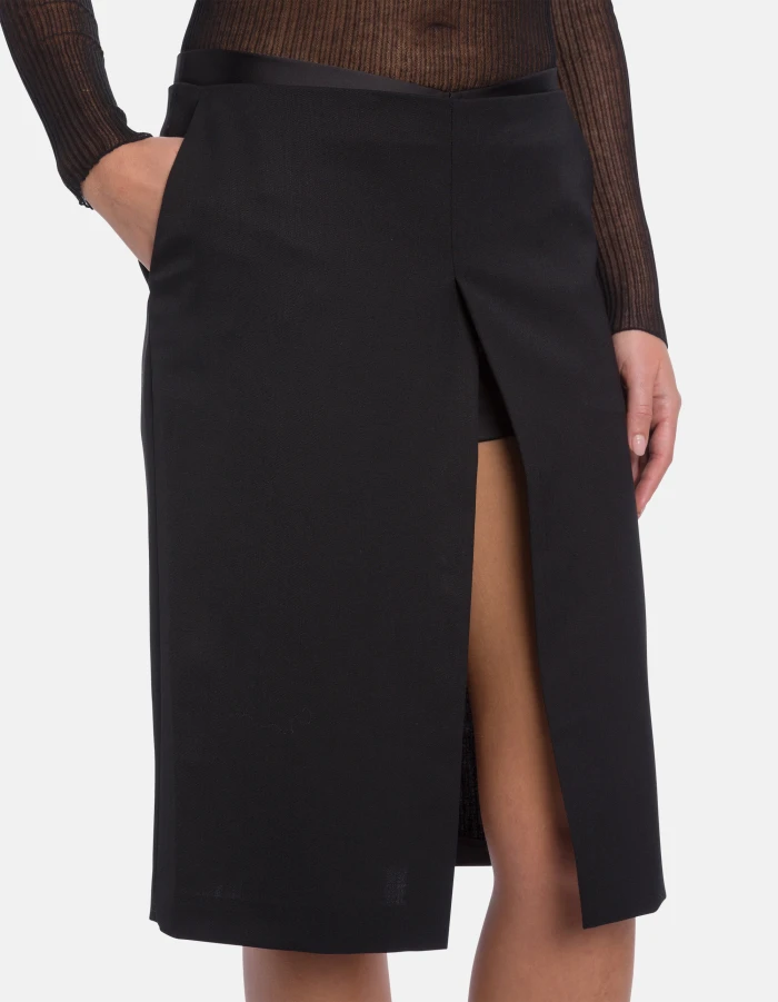 Knee-length skirt with deep central slit and satin inner shorts. Wool-blend gabardine. Dondup logo. Made in Italy