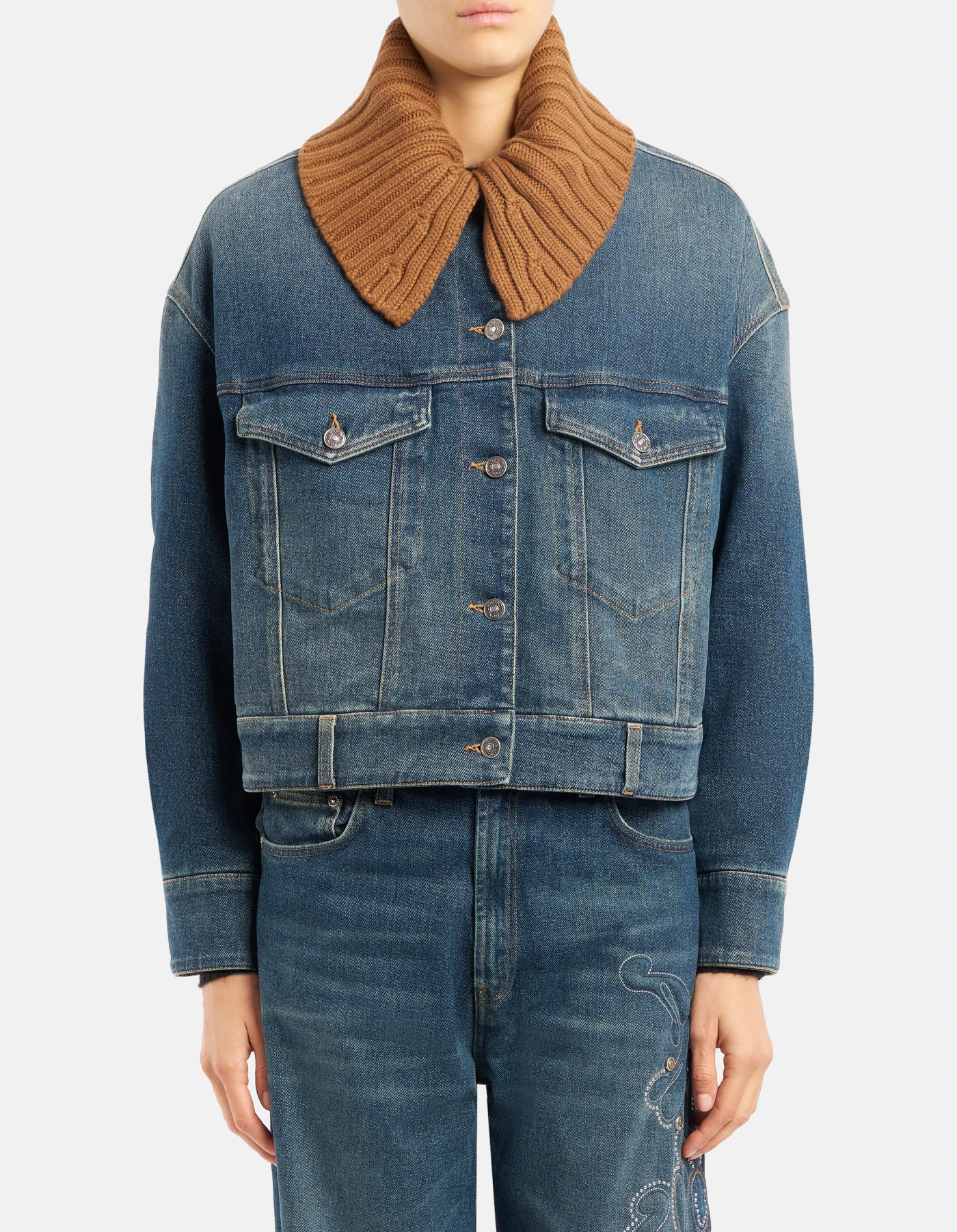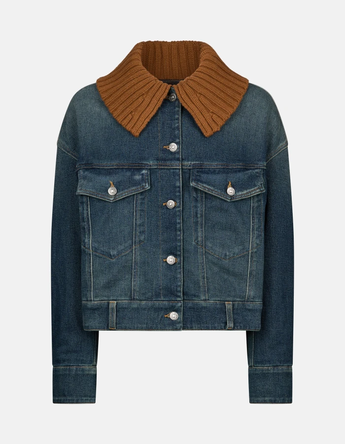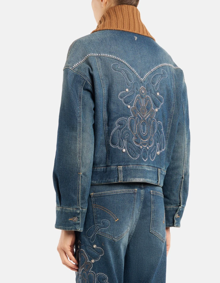 Boxy jacket with removable knitted collar. Padded with lightweight wadding. Embroidery and studs on the back. Blue 12 1/4 oz sustainable comfort denim. Dark vintage wash. Dondup logo. Made in Italy