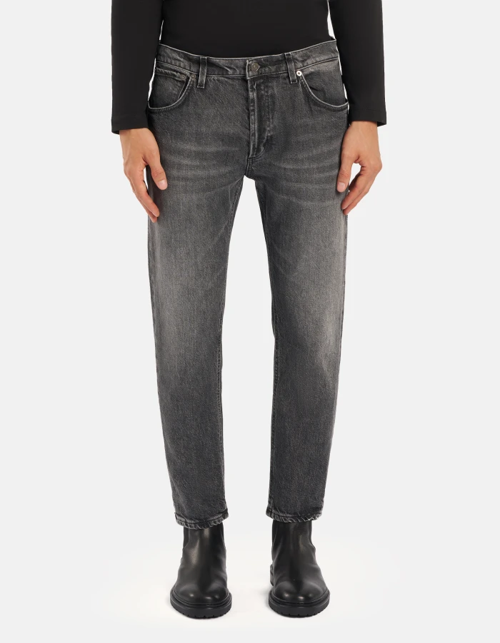 Brighton carrot-fit five-pocket jeans, low waist. Black 14 oz stretch comfort denim. Vintage clean black wash. Dondup logo. Made in Italy