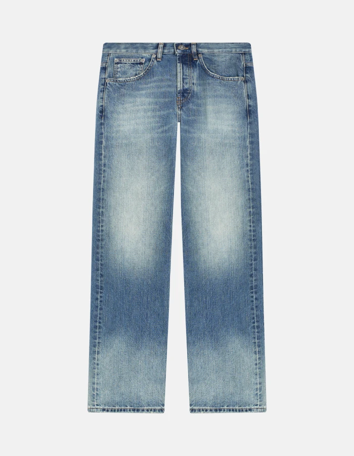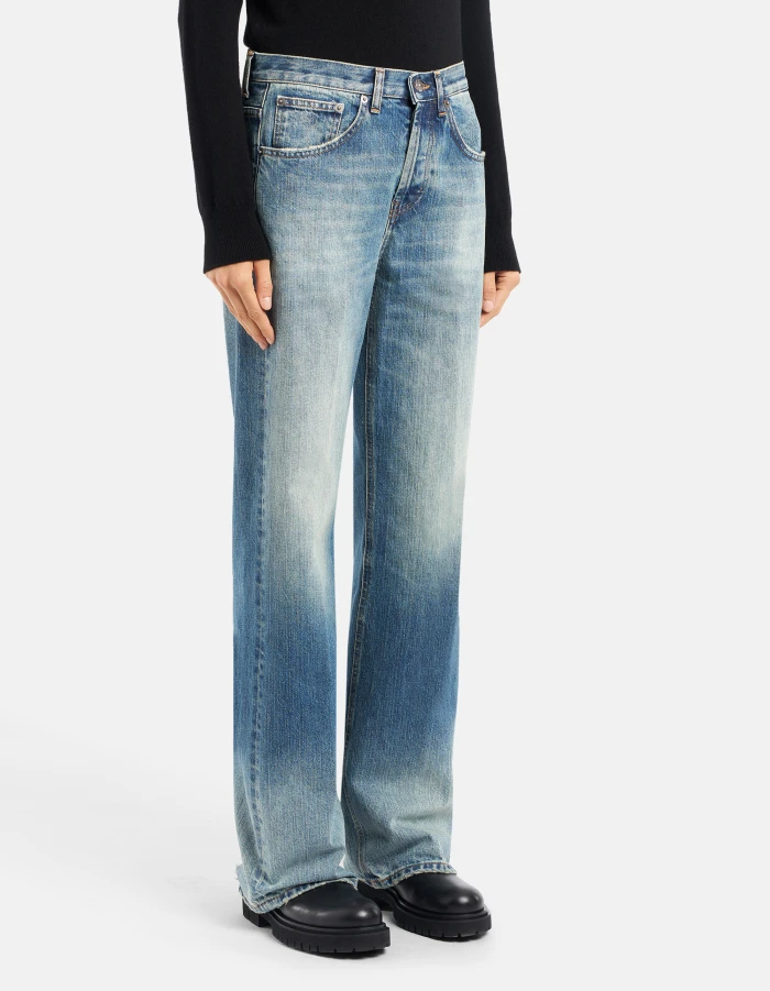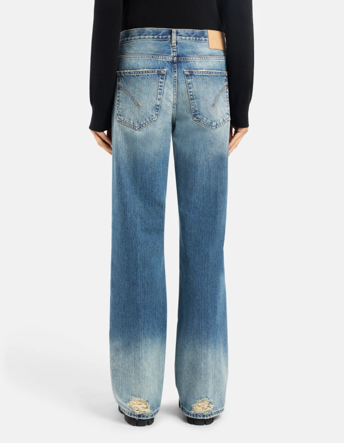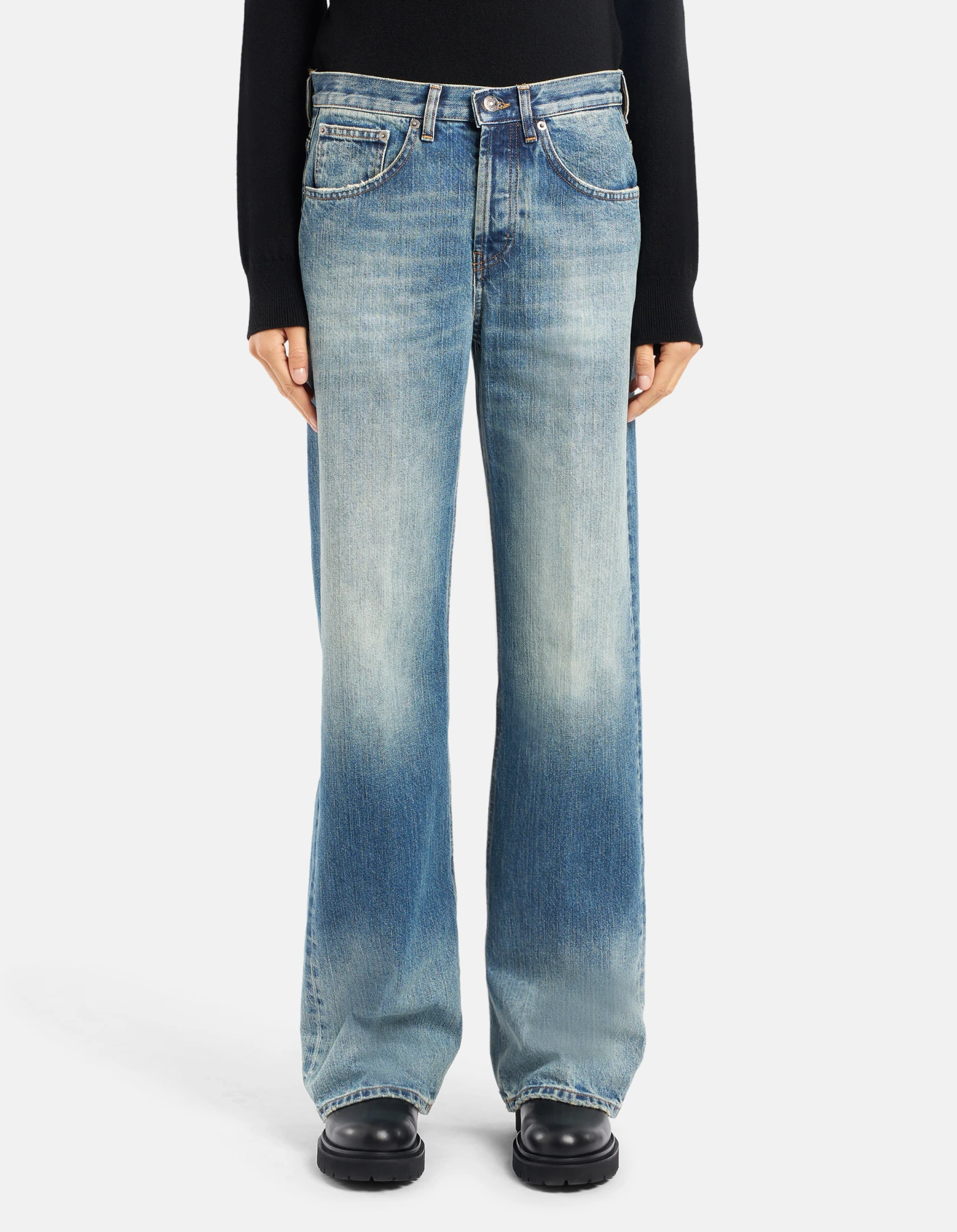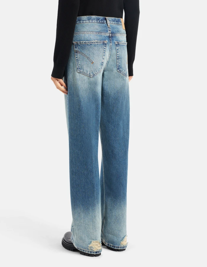 Jacklyn wide-leg five-pocket palazzo jeans, low waist. Blue 13 1/4 oz rigid slub denim. Vintage clean medium-dark wash. Dondup logo. Made in Italy