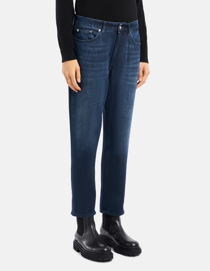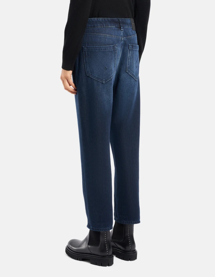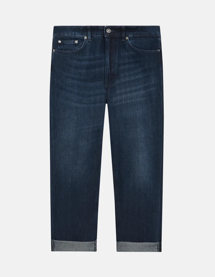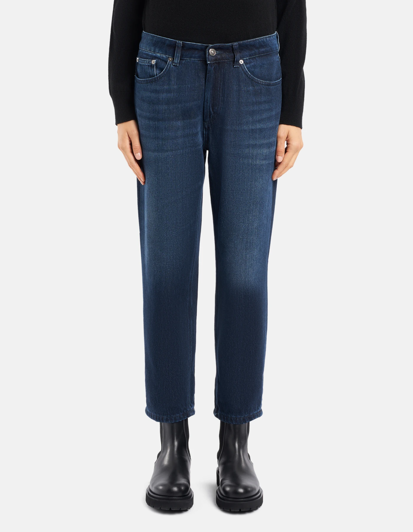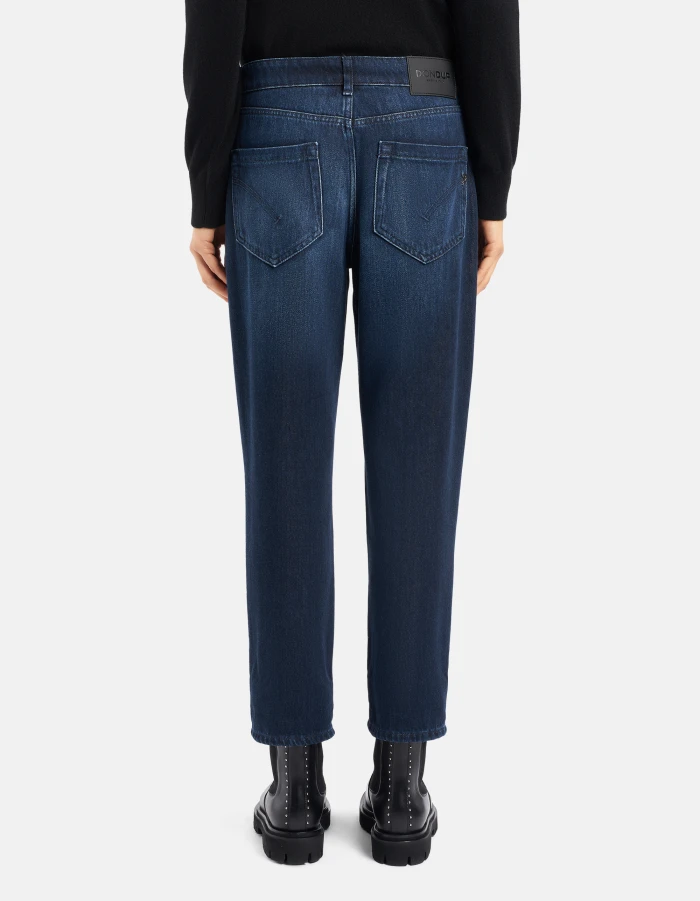 Koons loose-fit five-pocket jeans, regular waist, concealed button panel, ankle length. Blue 12 oz cotton and lyocell rigid denim. Clean dark wash. Dondup logo. Made in Italy