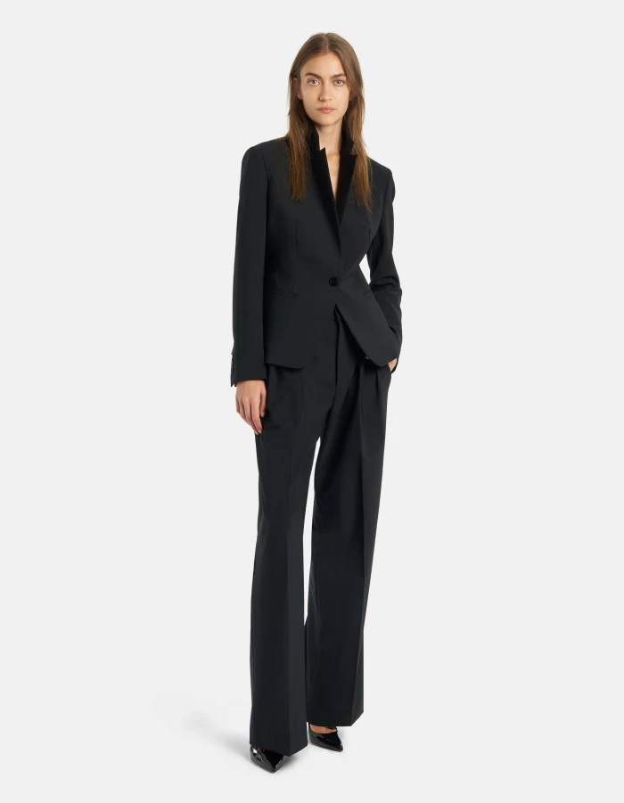 Lara loose-fit chino trousers, high waist, double darts on the front, welt pockets at the back. Bi-stretch weave. Dondup logo. Made in Italy