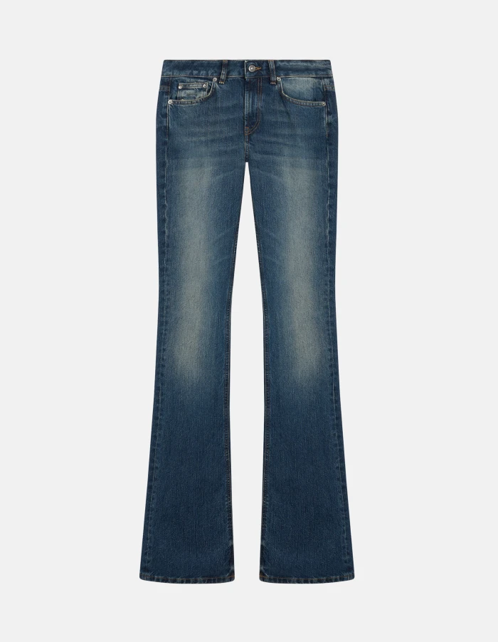 Newlola skinny-fit five-pocket bootcut jeans, high waist. Blue 13 1/4 oz rigid slub denim. Dark vintage wash with micro-rips. Dondup logo. Made in Italy