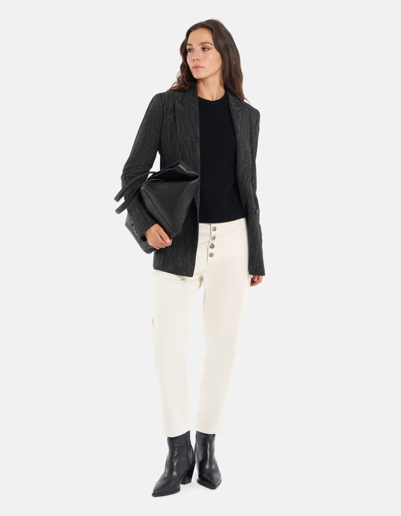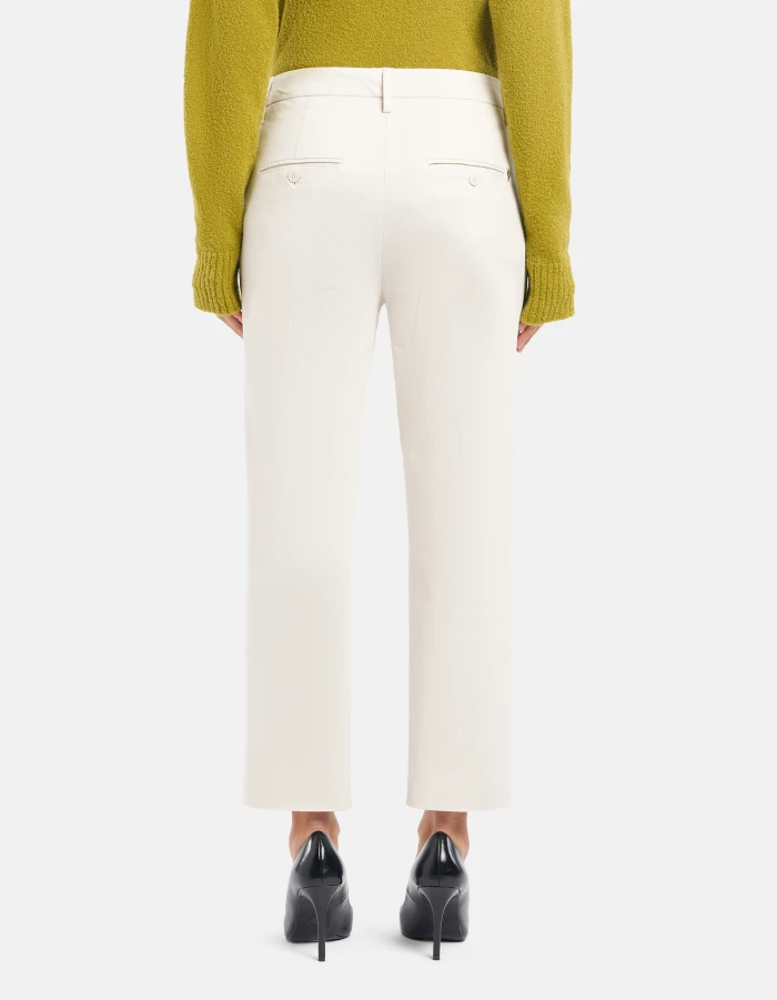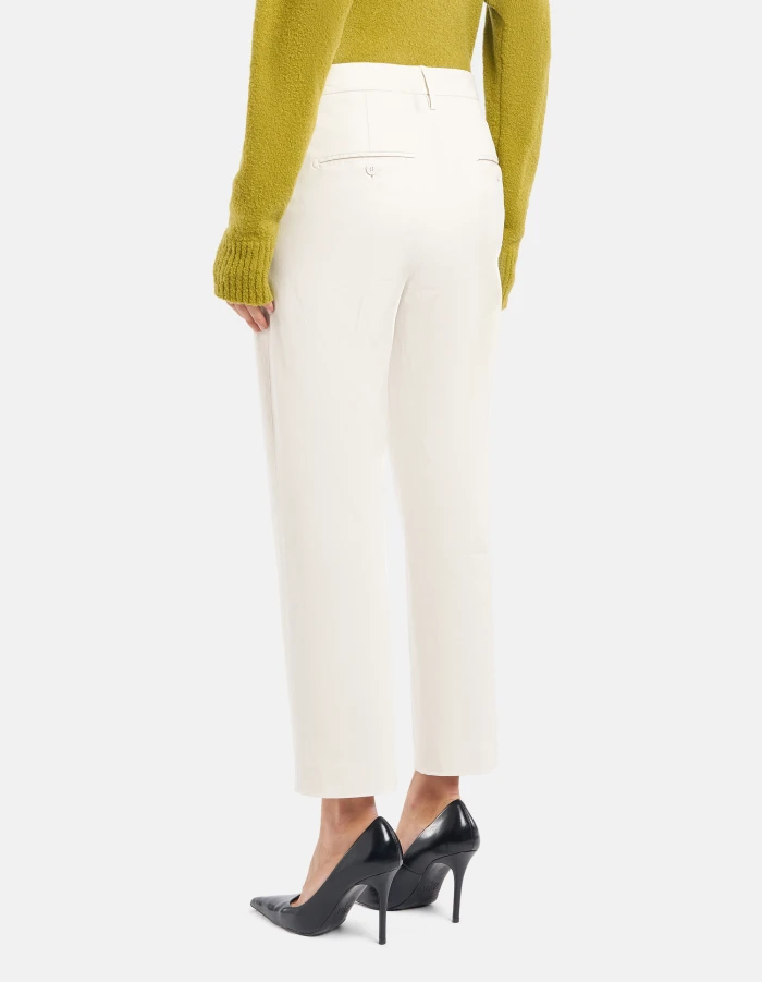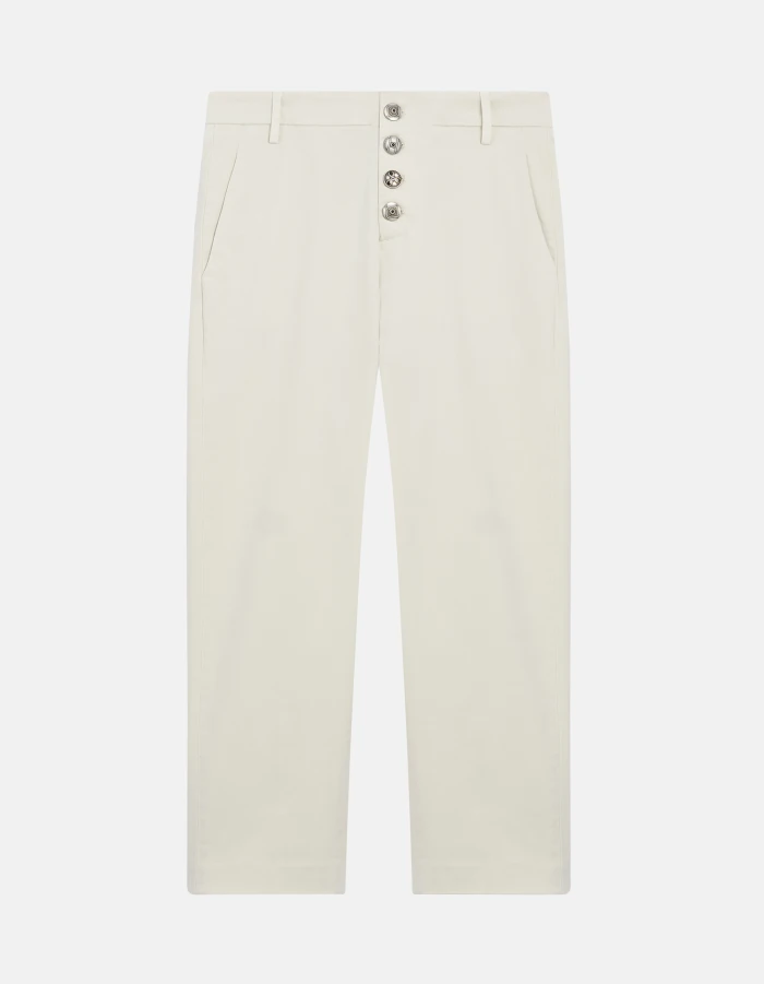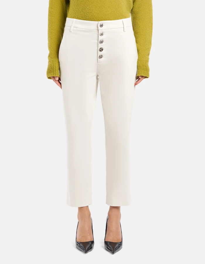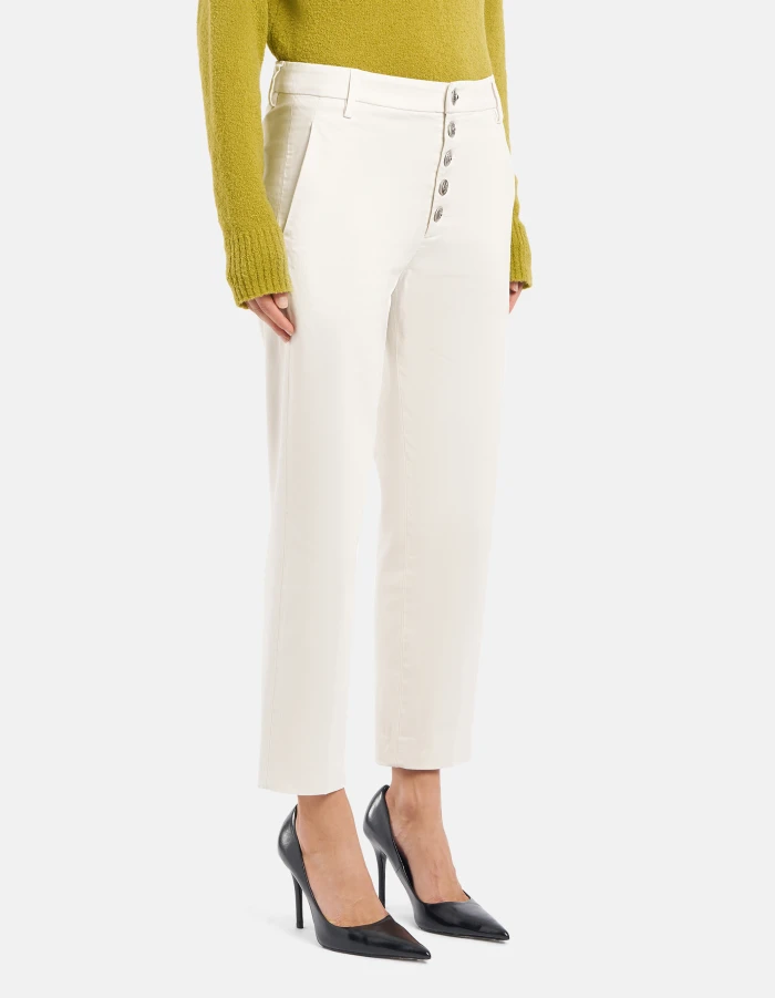 Nima loose-fit cropped chino trousers, regular waist, jewel button panel, welt pockets at the back. Warm hand stretch gabardine. Garment dyed. Dondup logo. Made in Italy