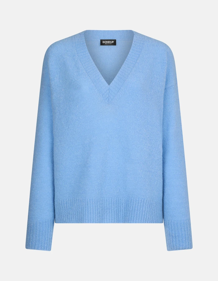 Oversized V-neck jumper with long sleeves and slits in ribbed hemline. Bouclé. Dondup logo. Made in Italy