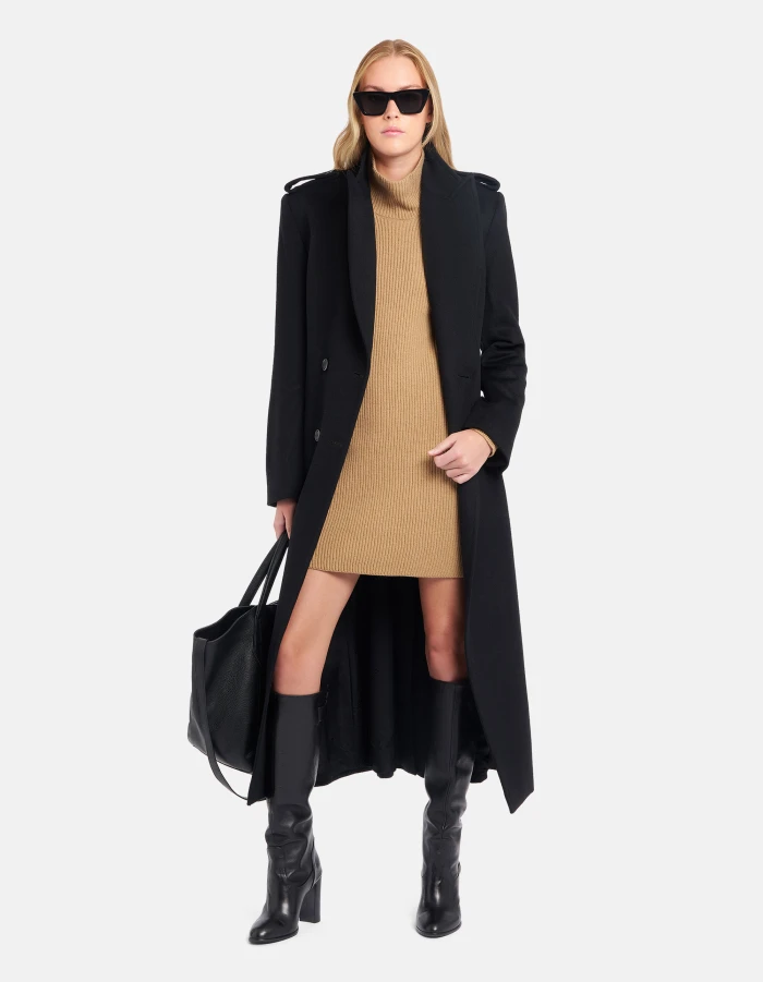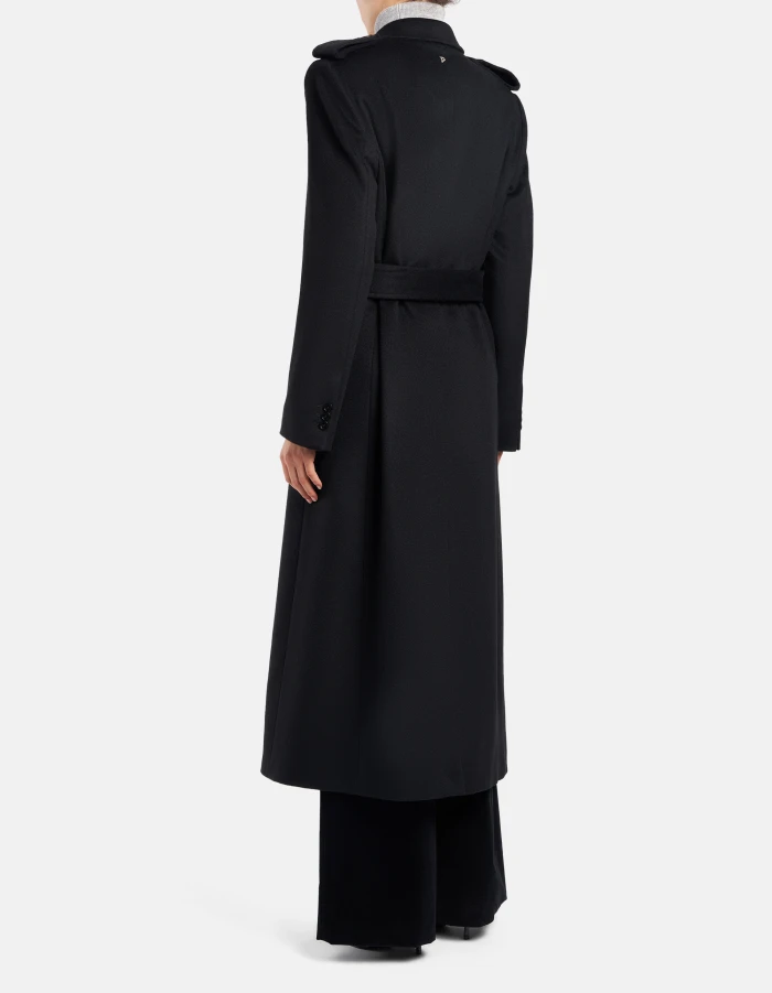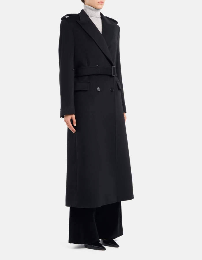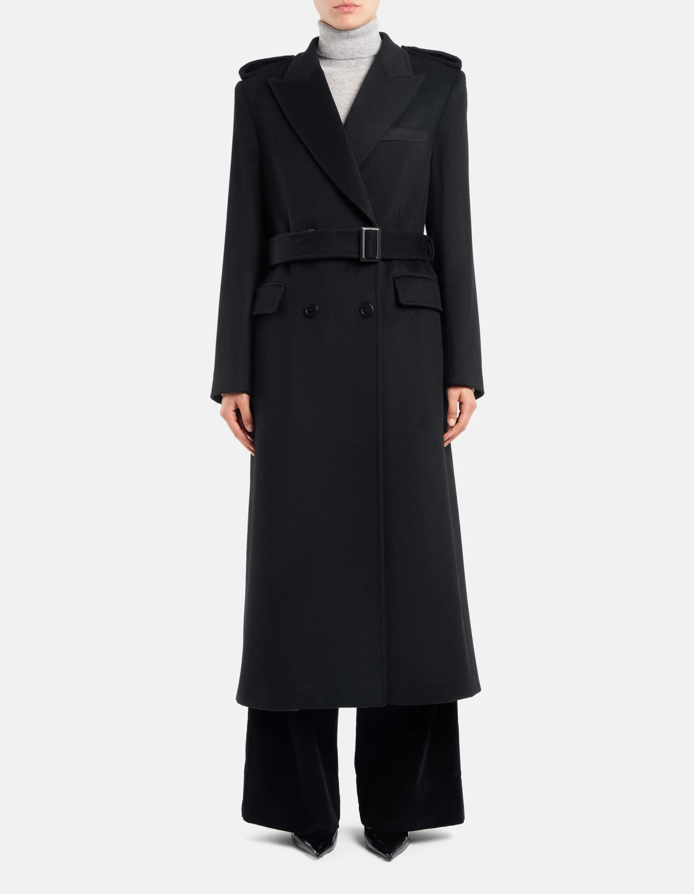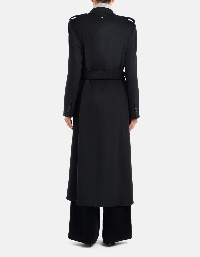 Regular-fit double-breasted coat with four buttons, flap pockets, belt with buckle and frogging on the shoulders. Wool cashmere velour. Dondup logo. Made in Italy