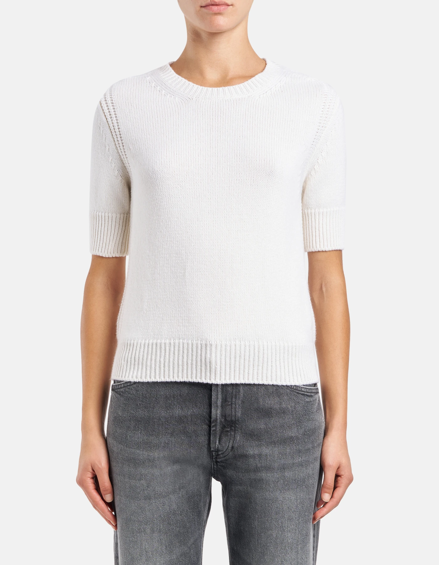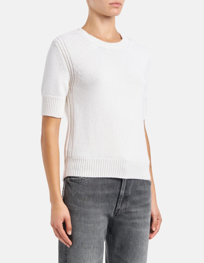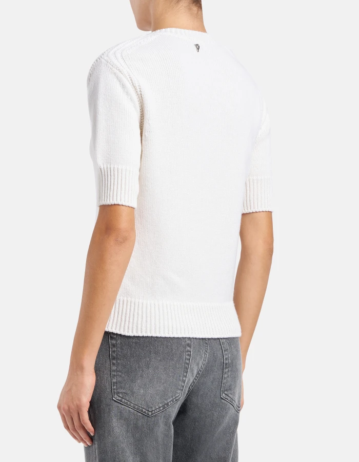 Regular-fit crew-neck jumper with short sleeves, ribbed sides, armholes and shoulders. Logo applique at the back. Smooth. Dondup logo. Made in Italy
