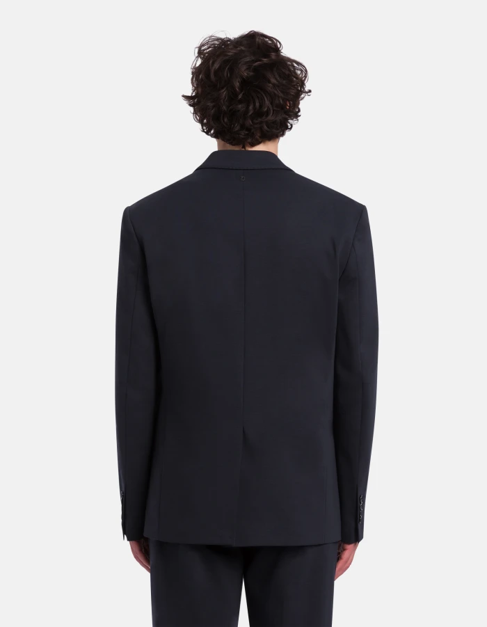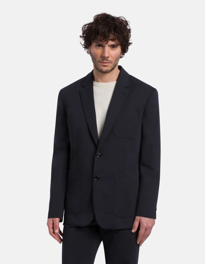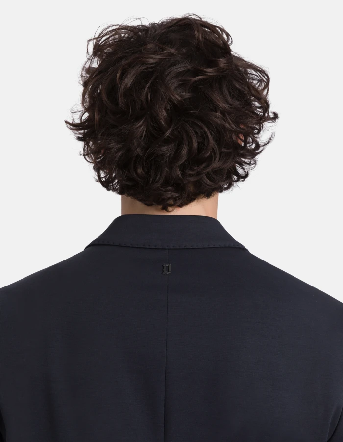 Slim-fit single-breasted lined blazer with two buttons and patch pockets. Milano stitch jersey. Dondup logo. Made in Italy