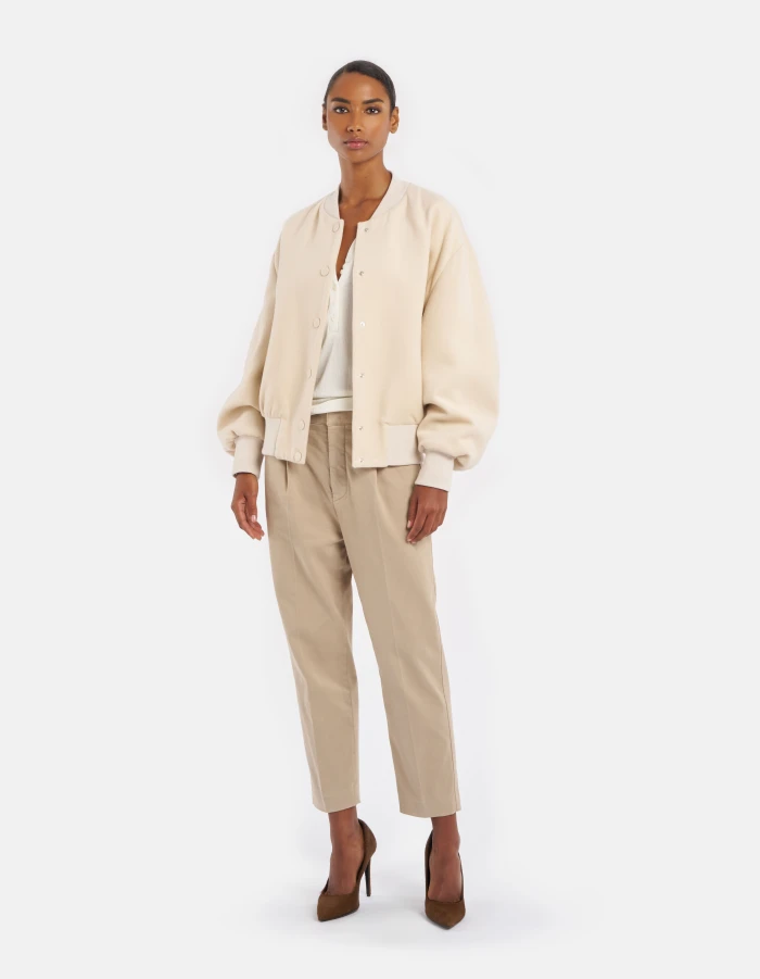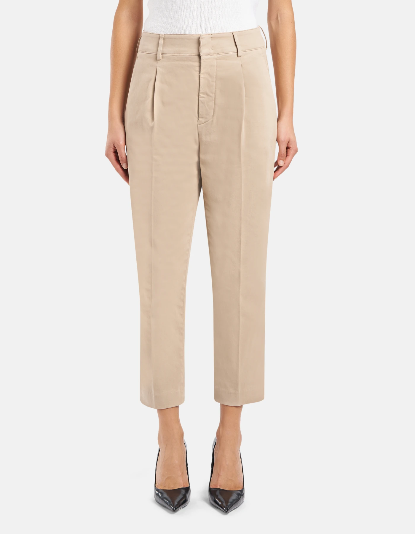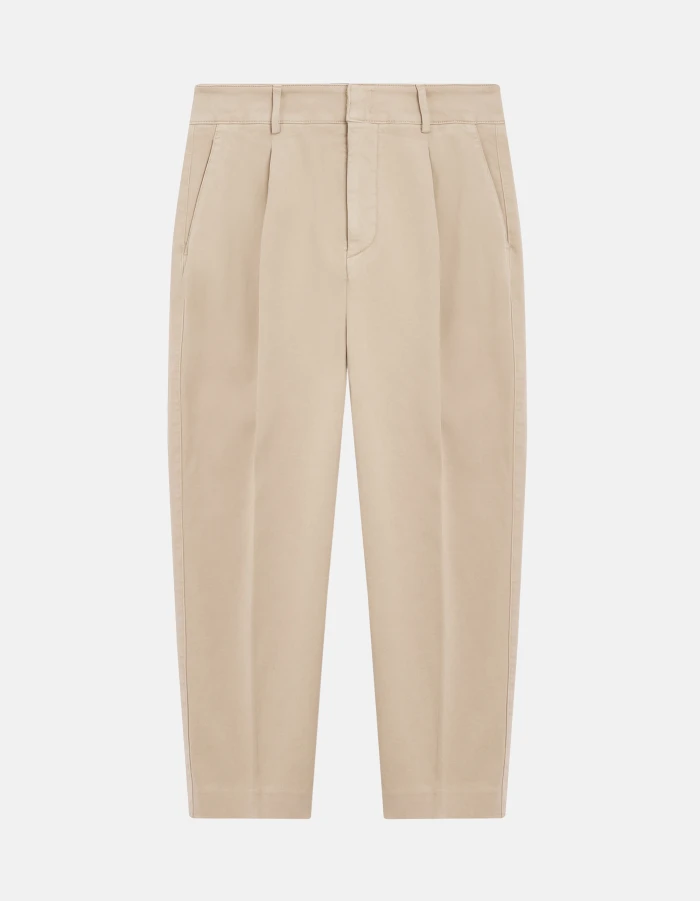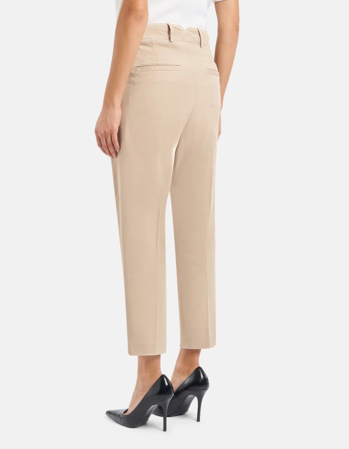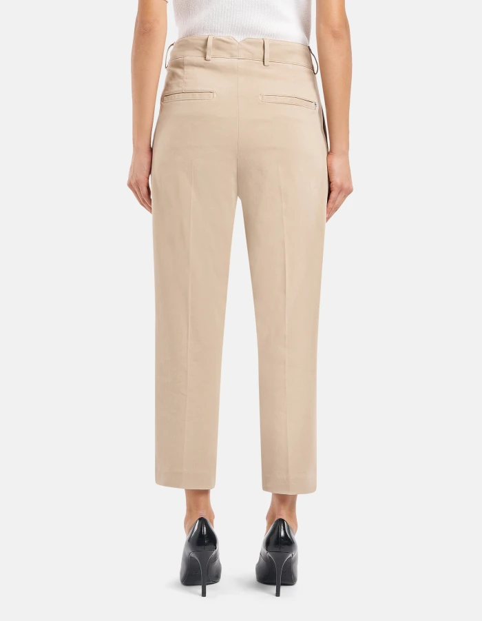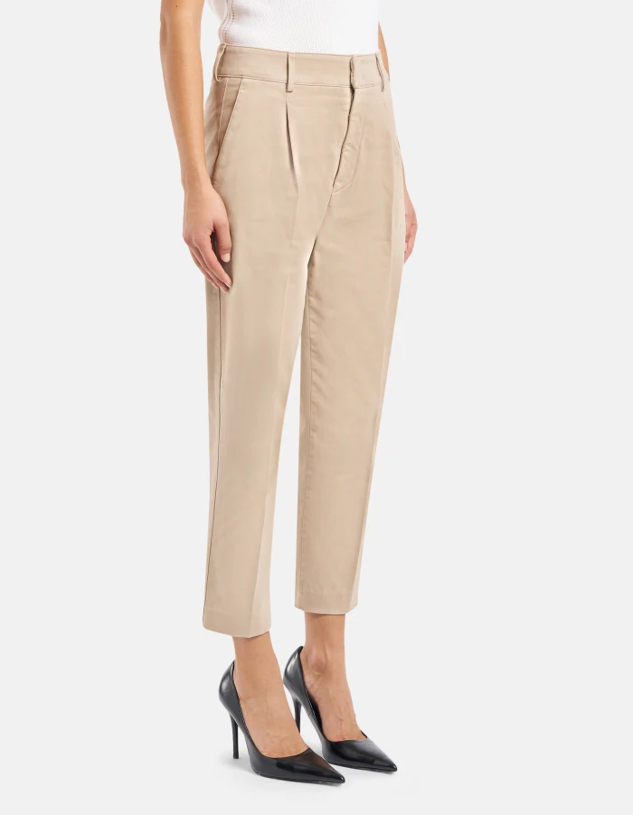 Tania loose-fit chino trousers, regular waist, front darts, welt pockets at the back. Stretch peach-texture satin. Garment dyed. Dondup logo. Made in Italy