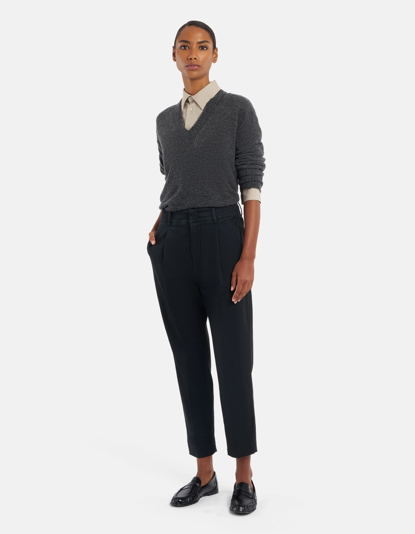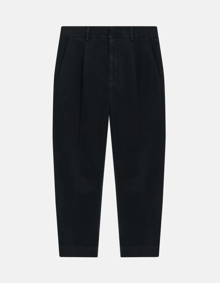 Tania loose-fit chino trousers, regular waist, front darts, welt pockets at the back. Stretch peach-texture satin. Garment dyed. Dondup logo. Made in Italy