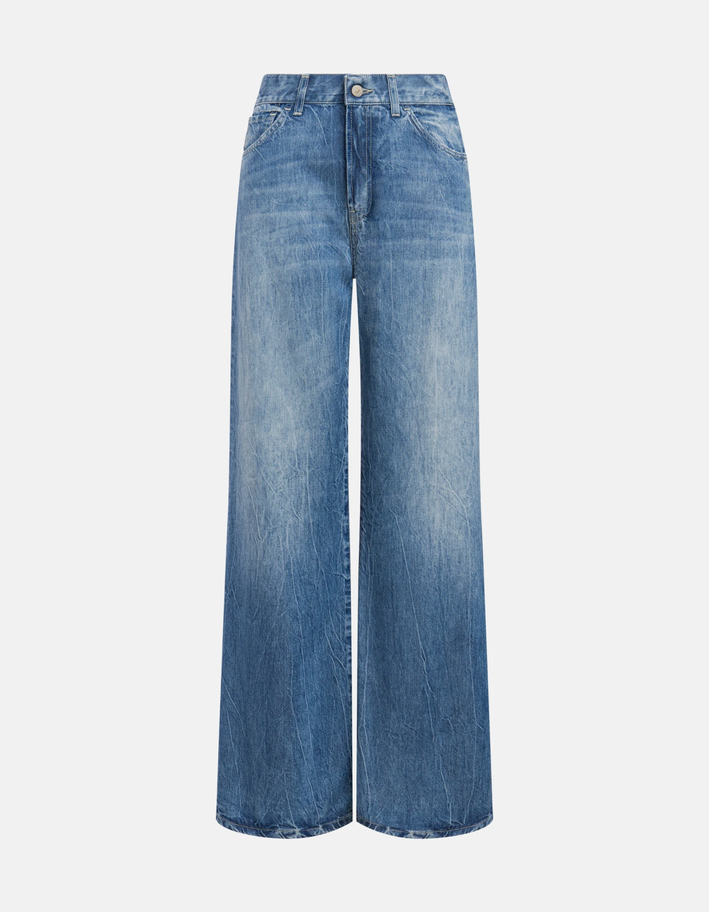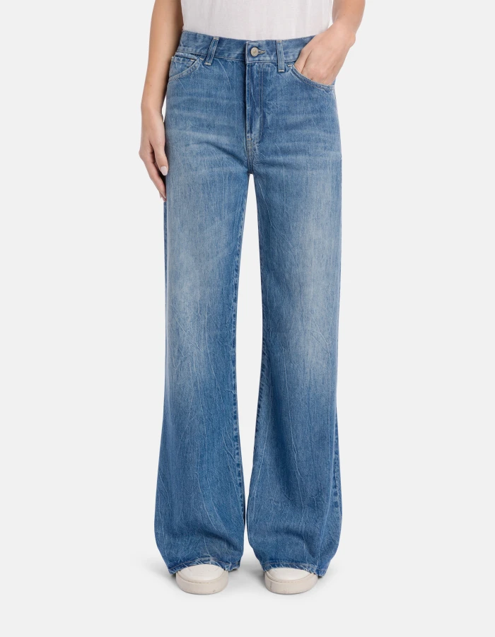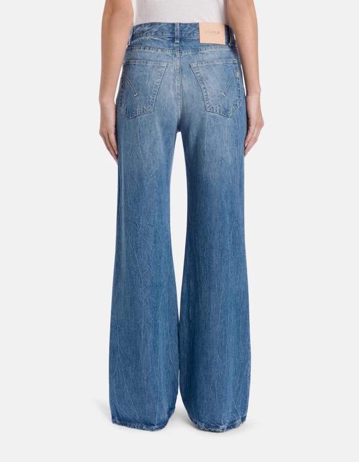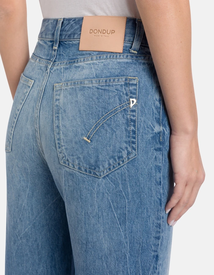 Amber wide-leg 5-pocket jeans, regular waist. 9 oz blue rigid lyocell denim. Clean medium light vintage wash. Dondup logo. Made in Italy
