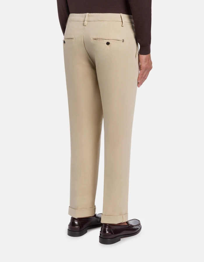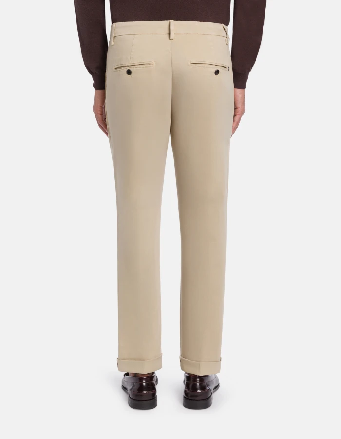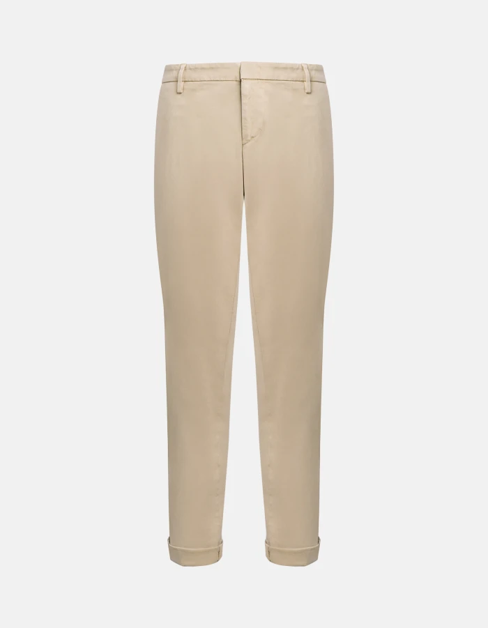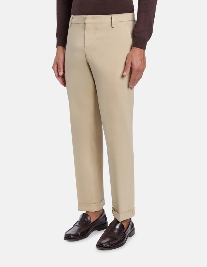 Gaubert regular-fit relax chino trousers, low waist, welt pockets at the back. Warm hand stretch gabardine. Garment dyed. Dondup logo. Made in Italy