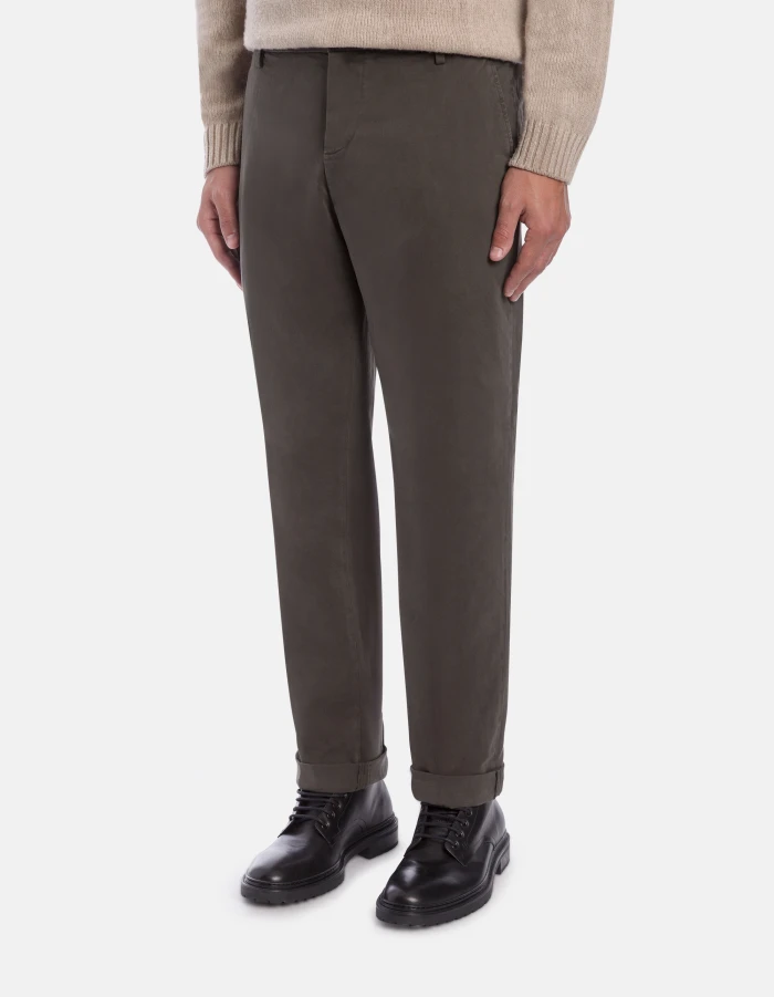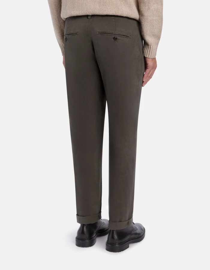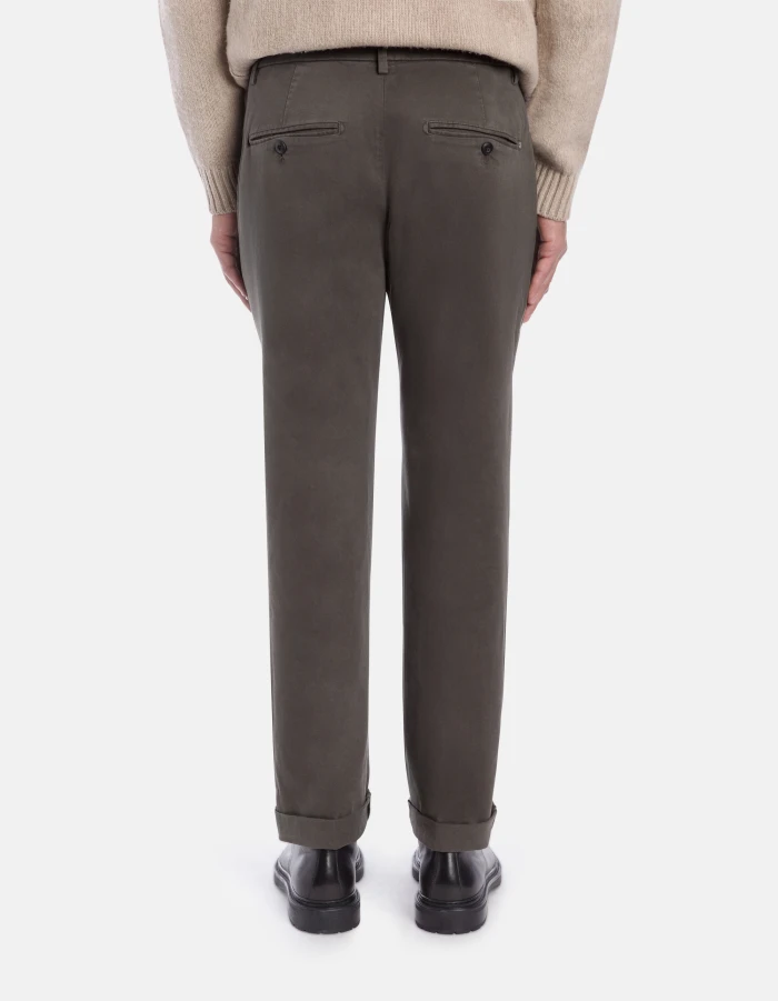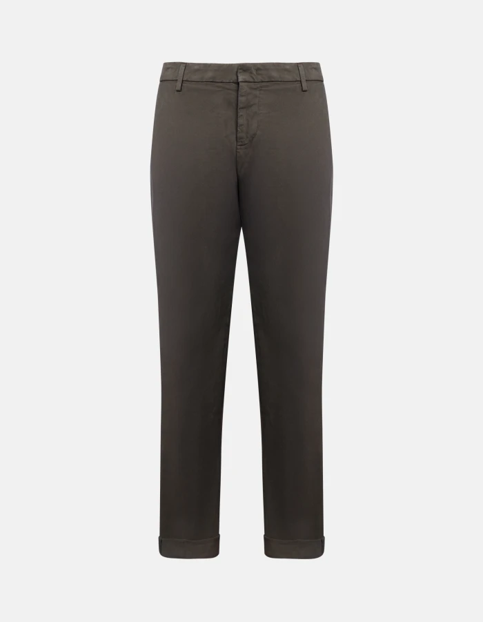 Gaubert regular-fit relax chino trousers, low waist, welt pockets at the back. Warm hand stretch gabardine. Garment dyed. Dondup logo. Made in Italy