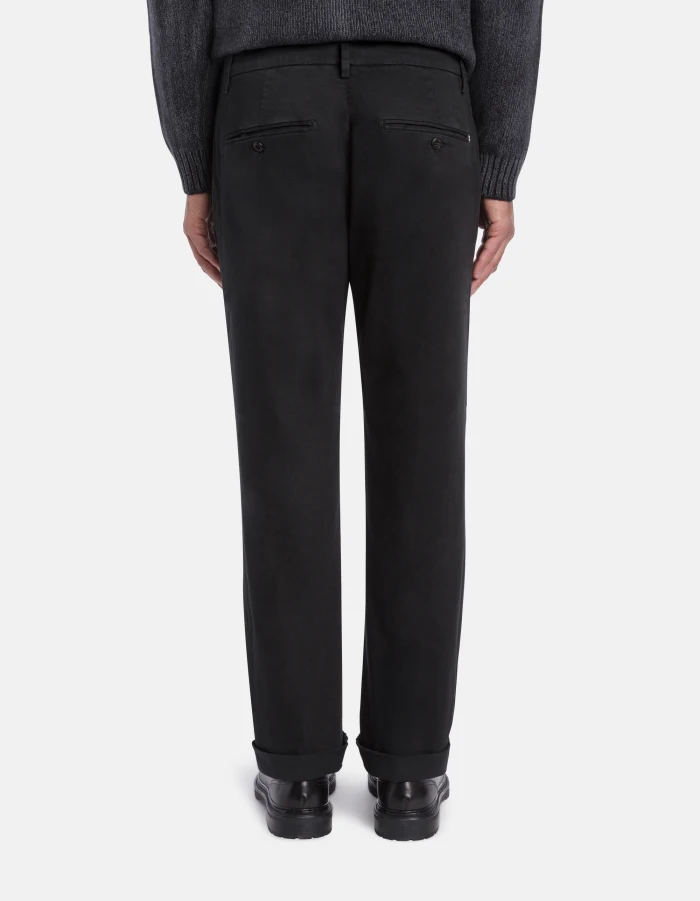Gaubert regular-fit relax chino trousers, low waist, welt pockets at the back. Warm hand stretch gabardine. Garment dyed. Dondup logo. Made in Italy