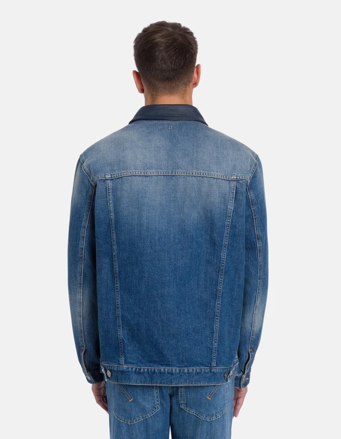 Regular-fit jacket with washable leather shirt collar, four patch pockets, unlined. Button fastening. Blue 13 oz salt & pepper rigid denim. Clean light wash with contrast pocket. Dondup logo. Made in Italy