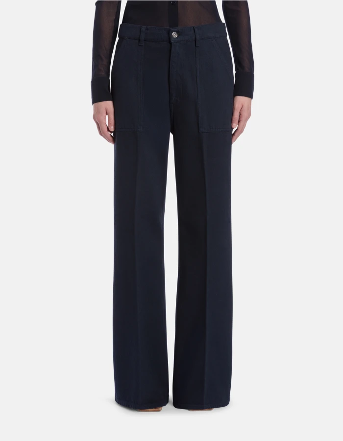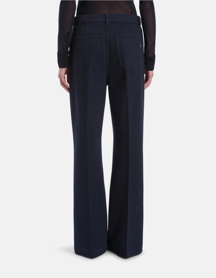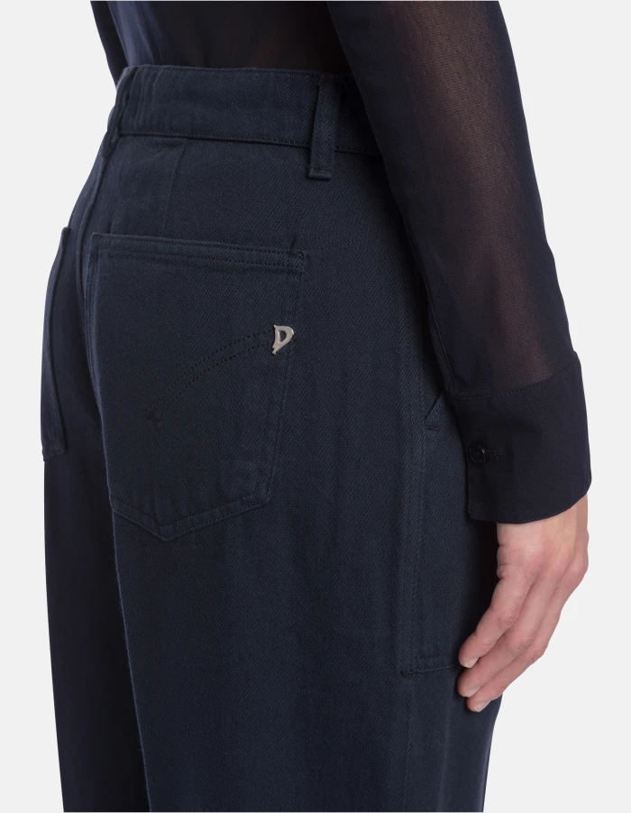 Amely wide-leg trousers, regular waist, fatigue pockets on the front. 10 1/4 oz bluesign APPROVED rigid bull denim. Garment-dyed. Dondup logo. Made in Italy