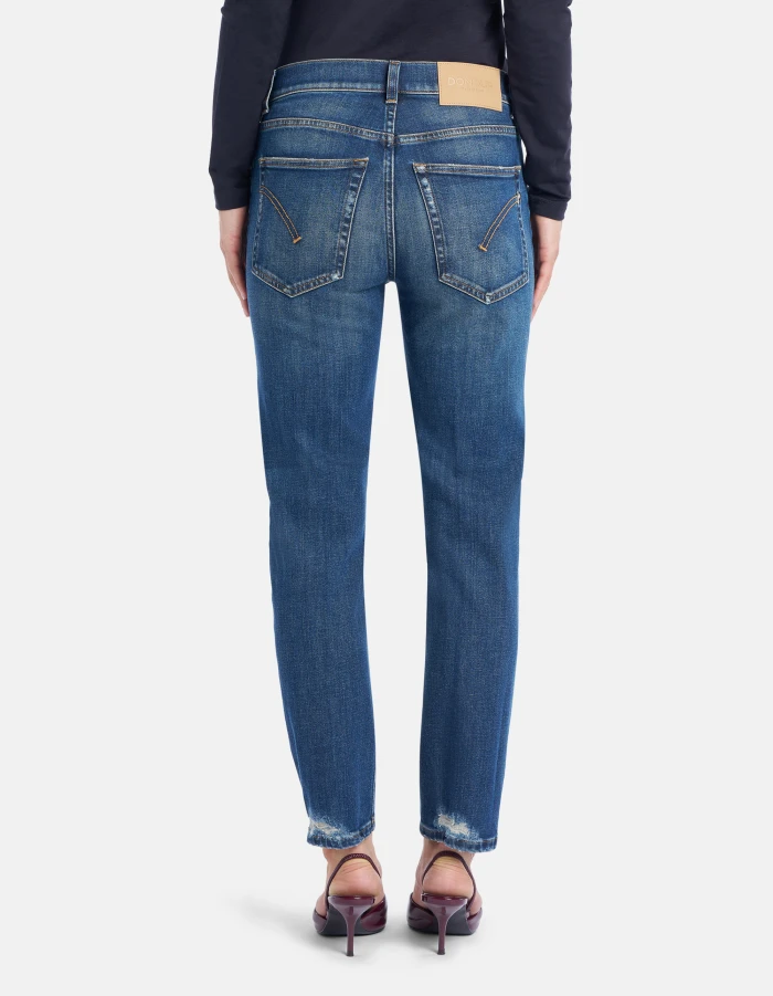 Daila slim-fit five-pocket jeans, regular waist, straight leg. Blue 11.50 oz bluesign APPROVED stretch denim. Bluesign medium vintage wash with rips. Dondup logo. Made in Italy