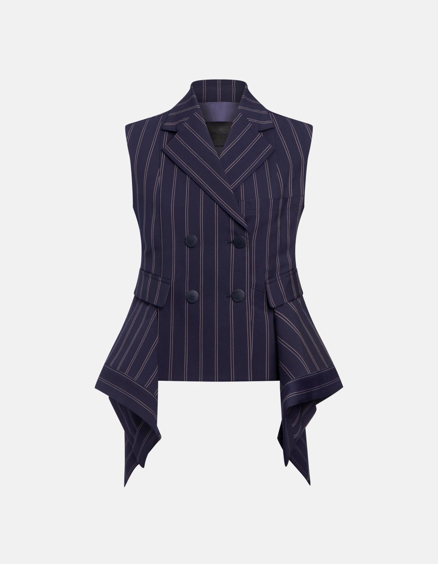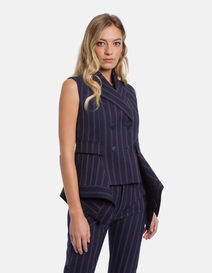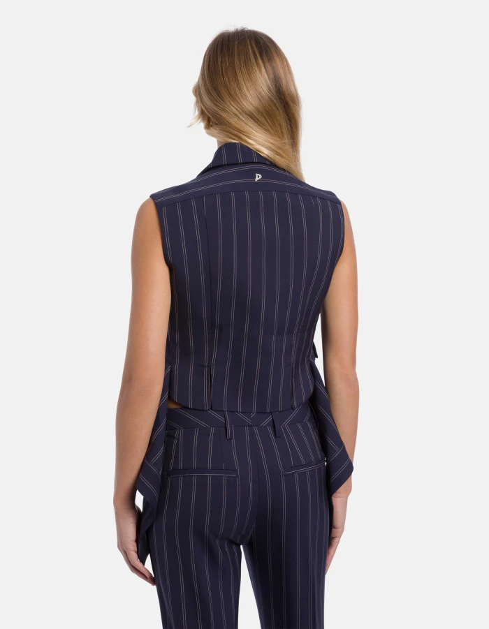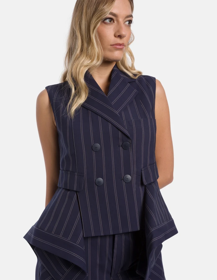 Regular-fit double-breasted waistcoat with four buttons, flap pockets and side godets. Pinstripe. Dondup logo. Made in Italy