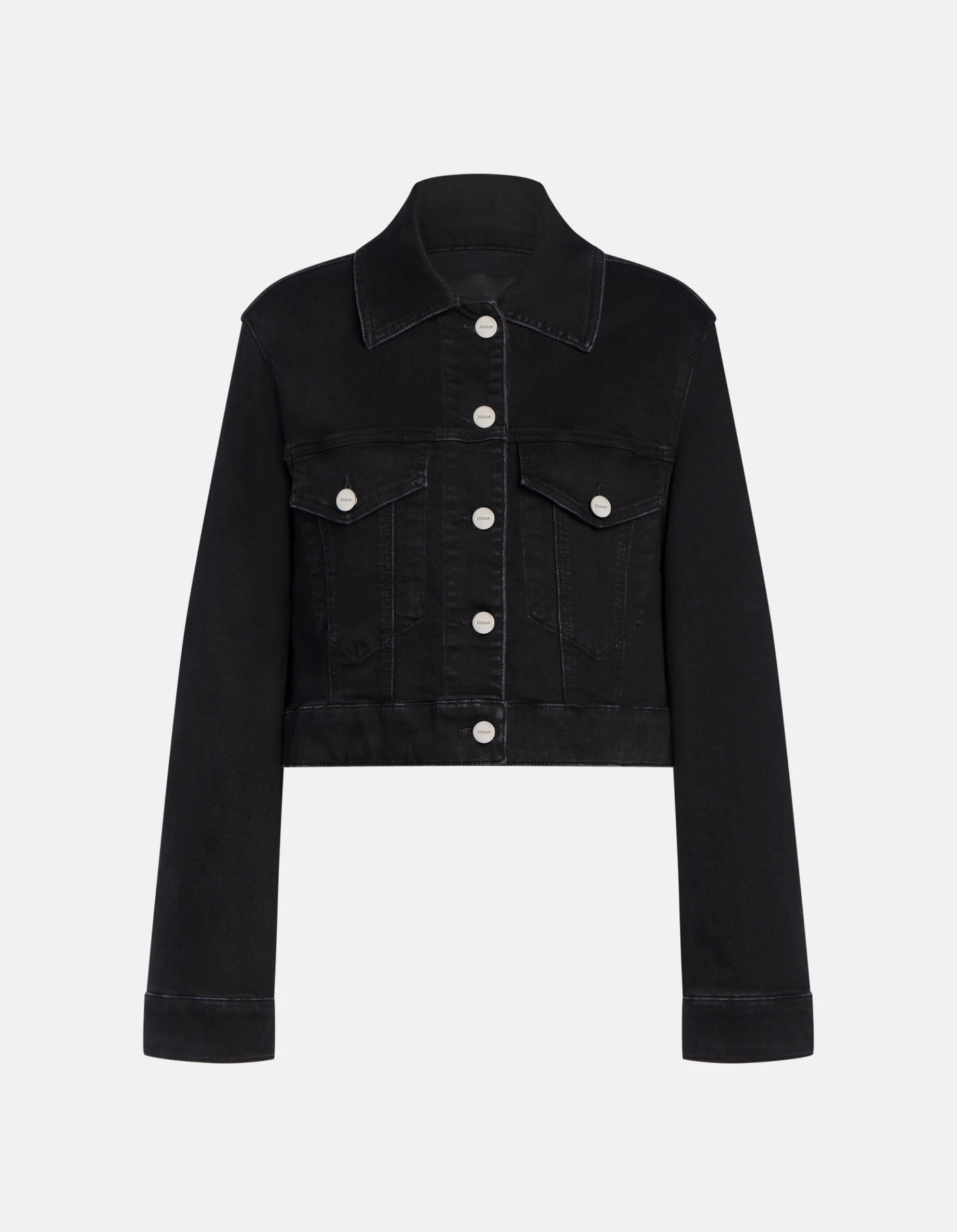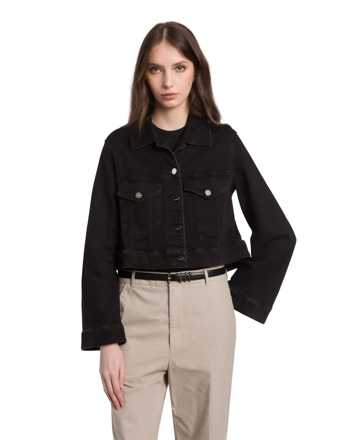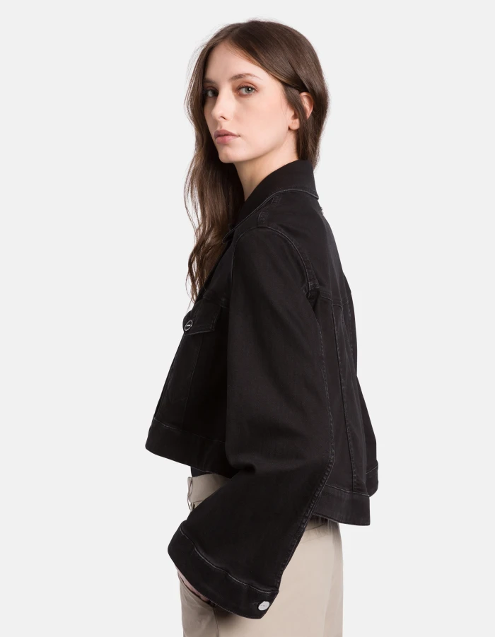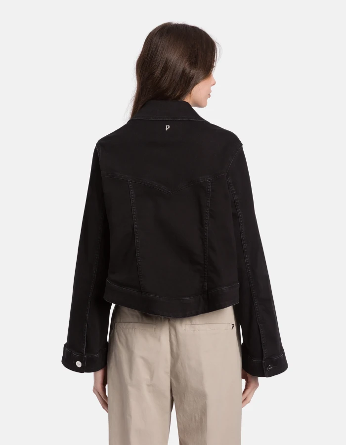 Regular-fit 5-pocket jacket, stud-button fastening and A-line sleeves. Black black 10 oz recycled stretch denim. Clean black wash. Dondup logo. Made in Italy