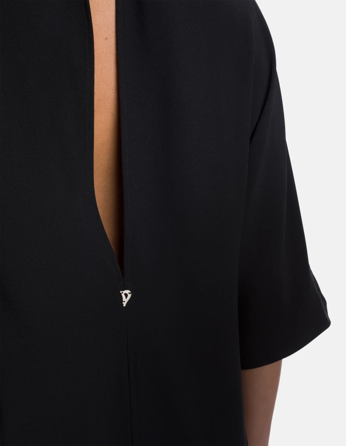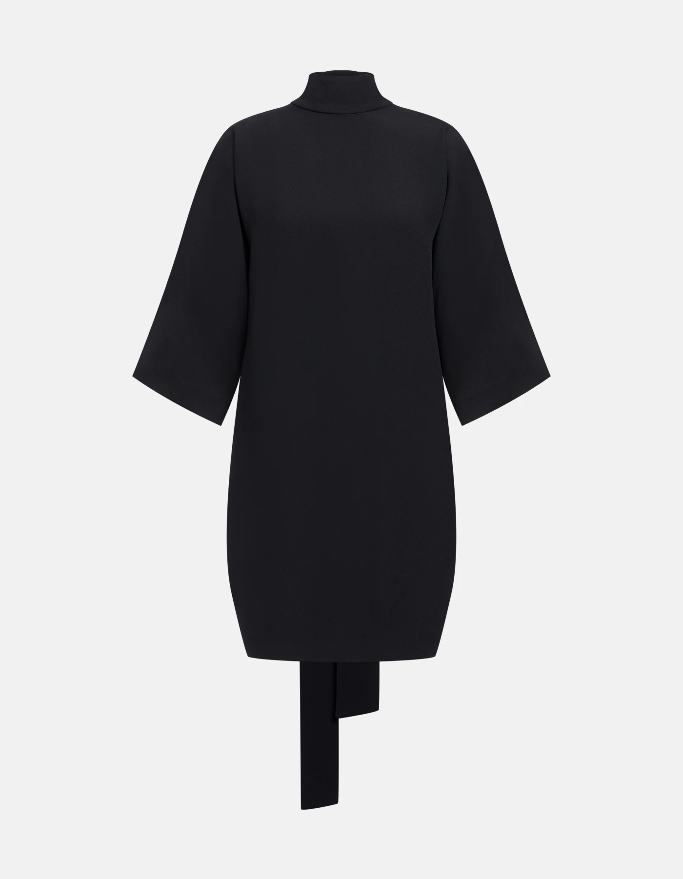 Abito corto con maniche a tre quarti, fusciacca che scende dallo scollo dietro ed apertura sulla schiena. Crêpe. Logo Dondup. Made in Italy