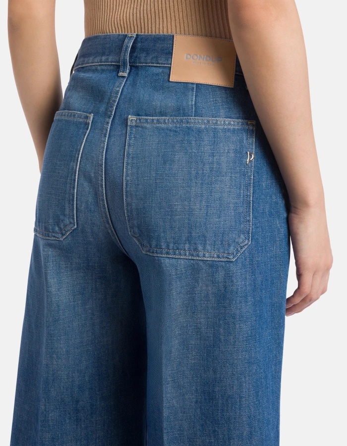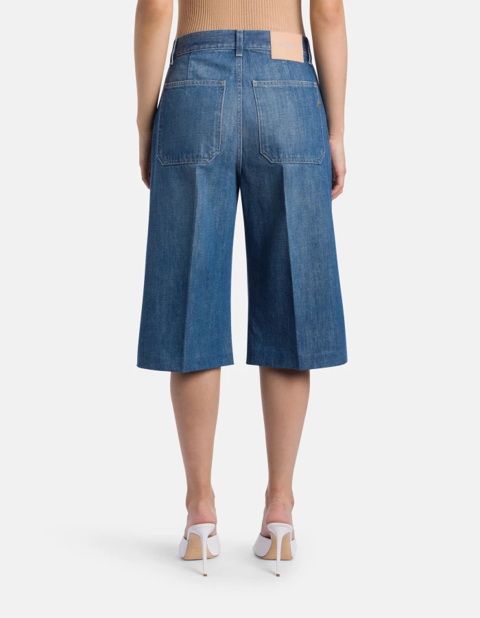 Bermuda Delfine regular fit, vita regolare, tasche a toppa applicate sul dietro. Denim fisso azzurro 11 1/4 oz. Lavaggio medio chiaro pulito. Logo Dondup. Made in Italy